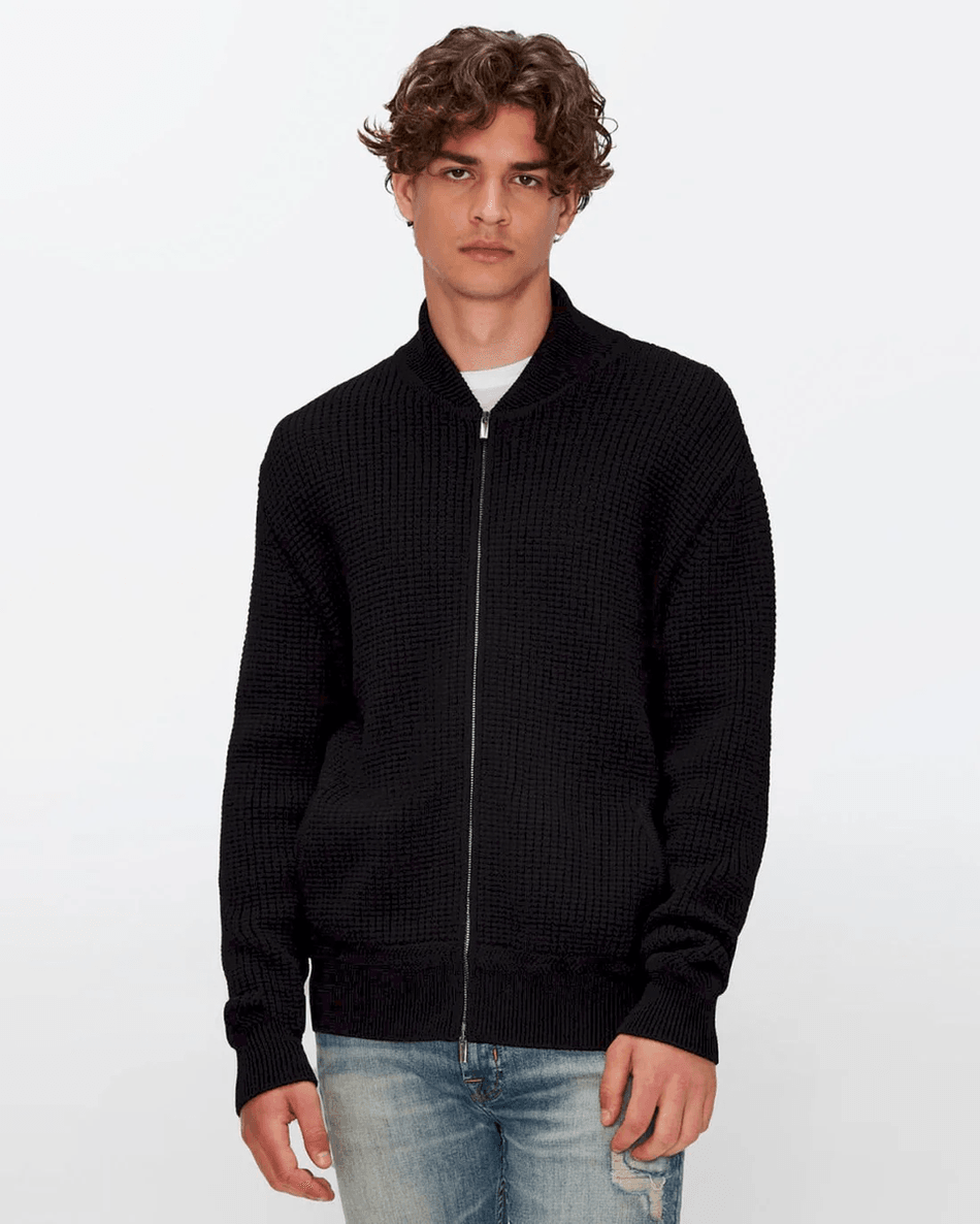 Discover the perfect blend of warmth and contemporary style with the 7 For All Mankind Wool Bomber Jacket in Black. Crafted from 100% premium wool, this jacket offers a soft hand feel that elevates your fall wardrobe. With its classic bomber shape, zip closure, and ribbed detailing, this jacket is a must-have for any fashion-forward man.