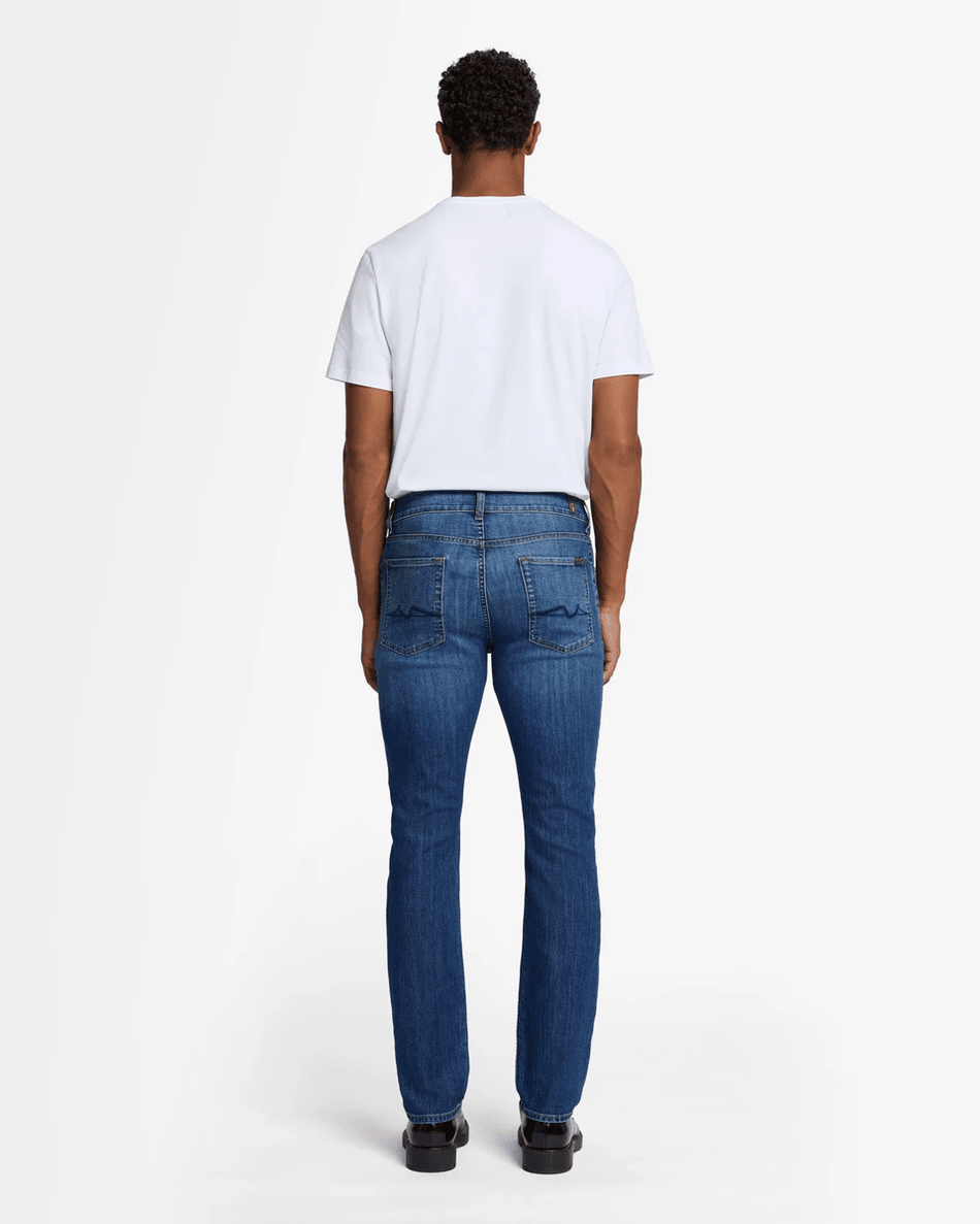 Elevate your denim collection with the 7 For All Mankind Airweft Slimmy in Forte Forte. This modern slim-fit jean combines style and comfort, offering a sleek silhouette that flatters every body type without feeling restrictive.