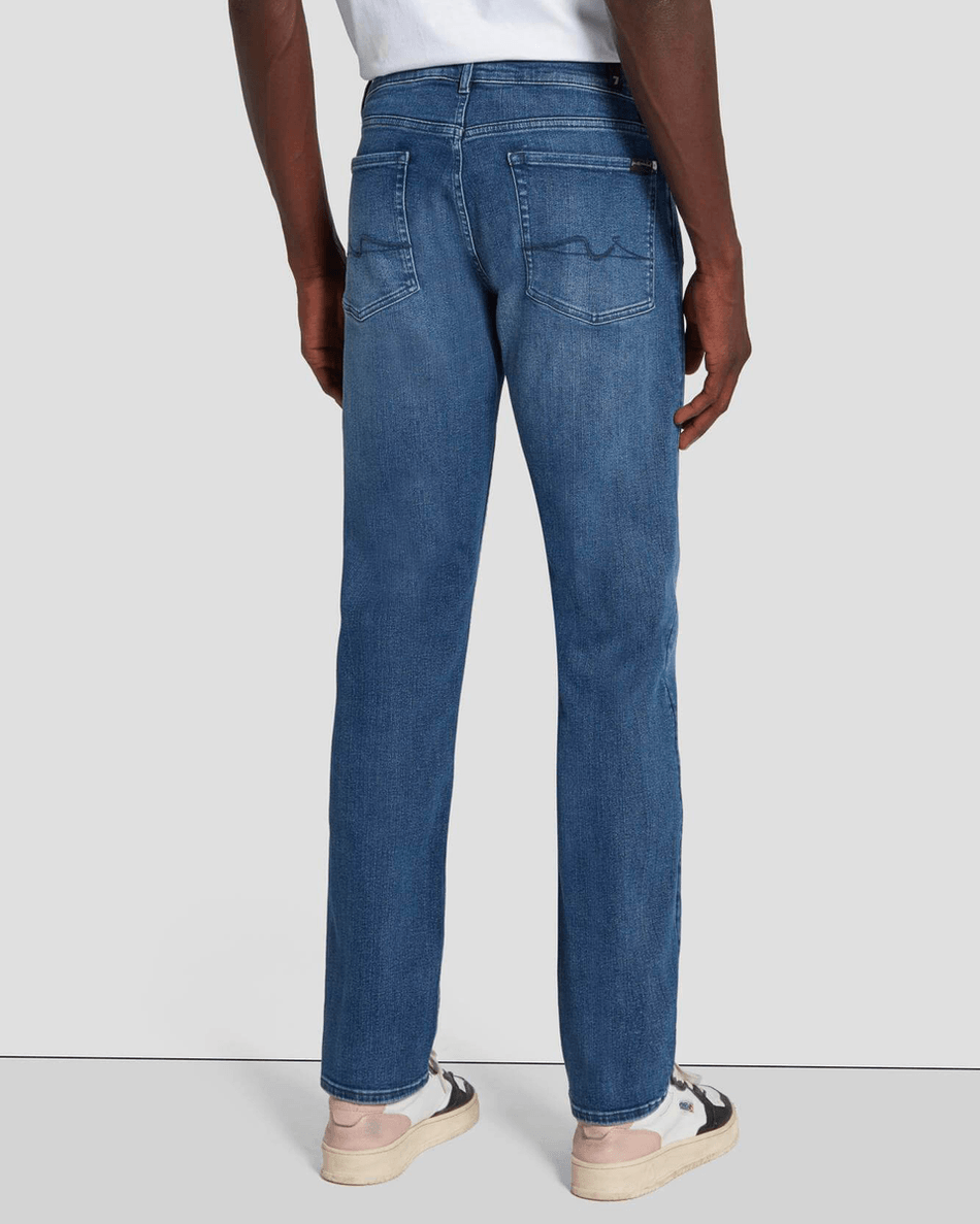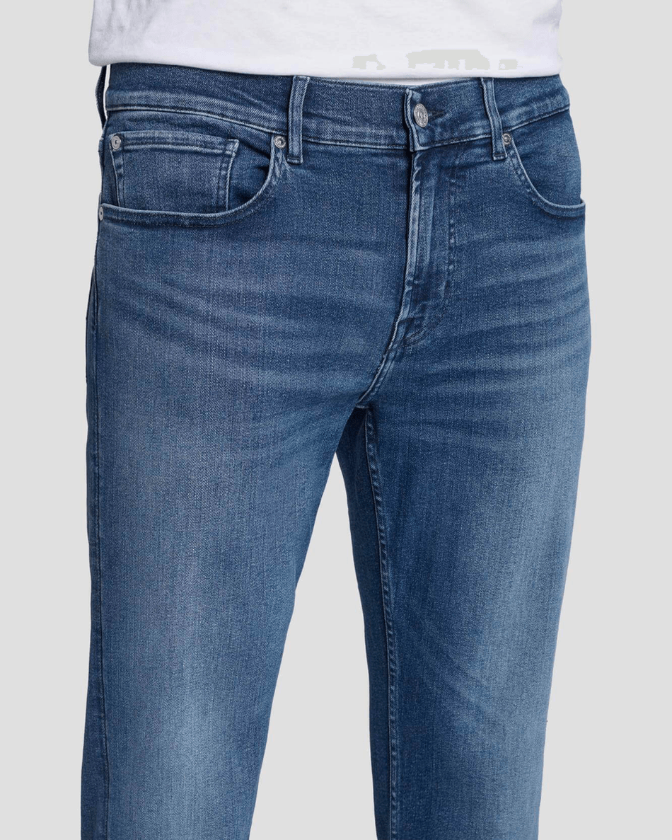 The 7 For All Mankind EarthKind Stretch Tek Slimmy in Maze Maze features power-stretch technology that adapts to your movements, ensuring maximum comfort whether you're at work or out on the town. The easy medium blue wash adds a timeless appeal, while natural whiskering and fading provide a touch of uniqueness to each pair.