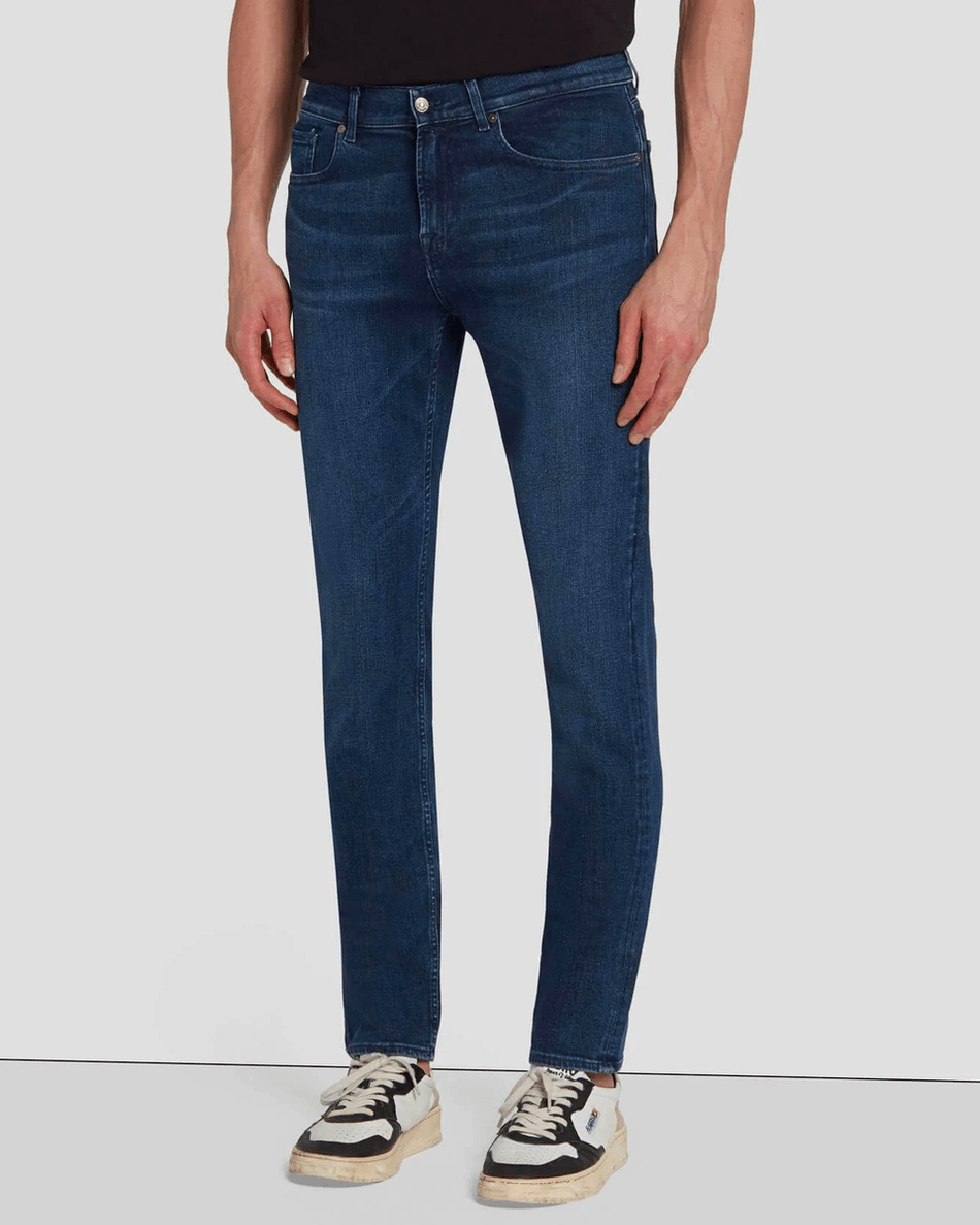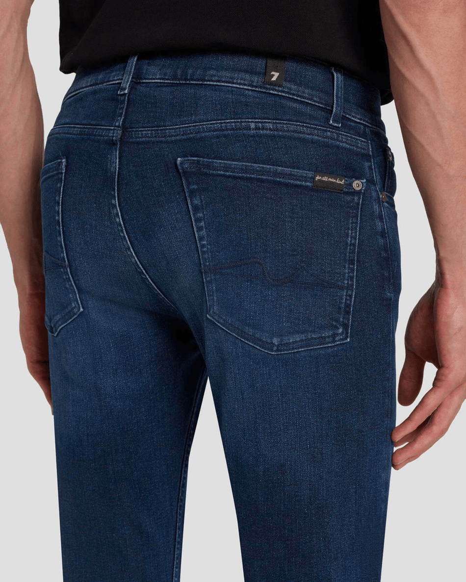 Elevate your denim collection with the 7 For All Mankind EarthKind Stretch Tek Slimmy in Rebus. This stylish pair of jeans not only offers exceptional comfort but also champions sustainability, making them a smart choice for both your wardrobe and the planet.