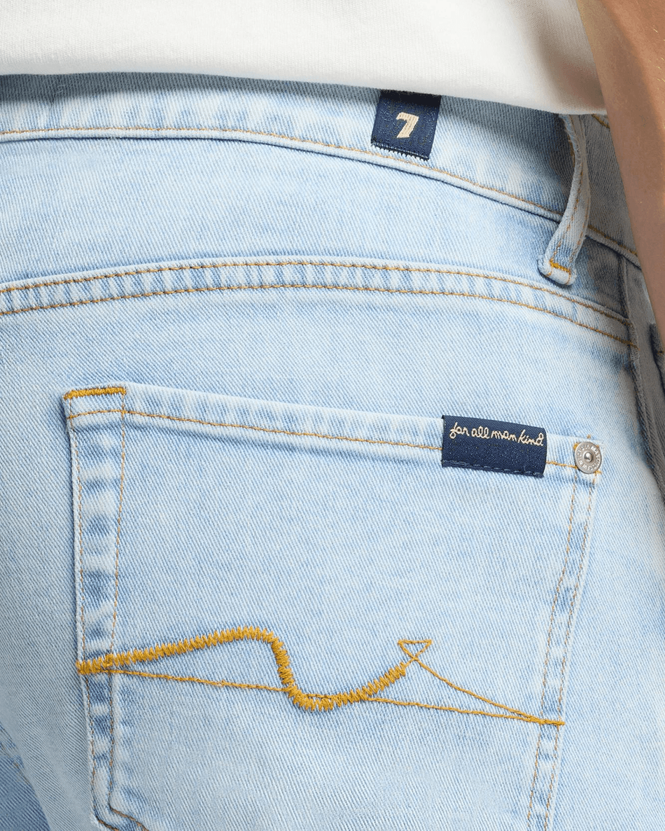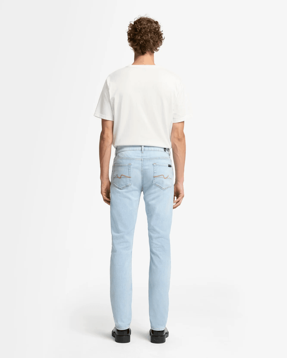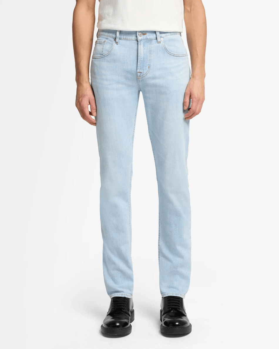 Elevate your denim collection with the 7 For All Mankind Left Hand Slimmy Tapered in Studio Blue. This pair of jeans combines modern style with exceptional comfort, making it a must-have for any fashion-forward individual. The fresh light blue wash adds a vibrant touch to your wardrobe while ensuring versatility for any occasion.