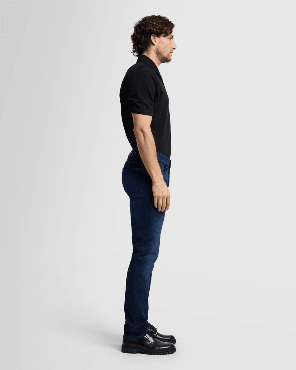 Experience the perfect blend of style and comfort with the 7 For All Mankind Luxe Performance Plus Slimmy in Deep Blue. This slim fit jean is designed to enhance your silhouette from hip to hem, offering a tailored look that easily transitions from day to night.