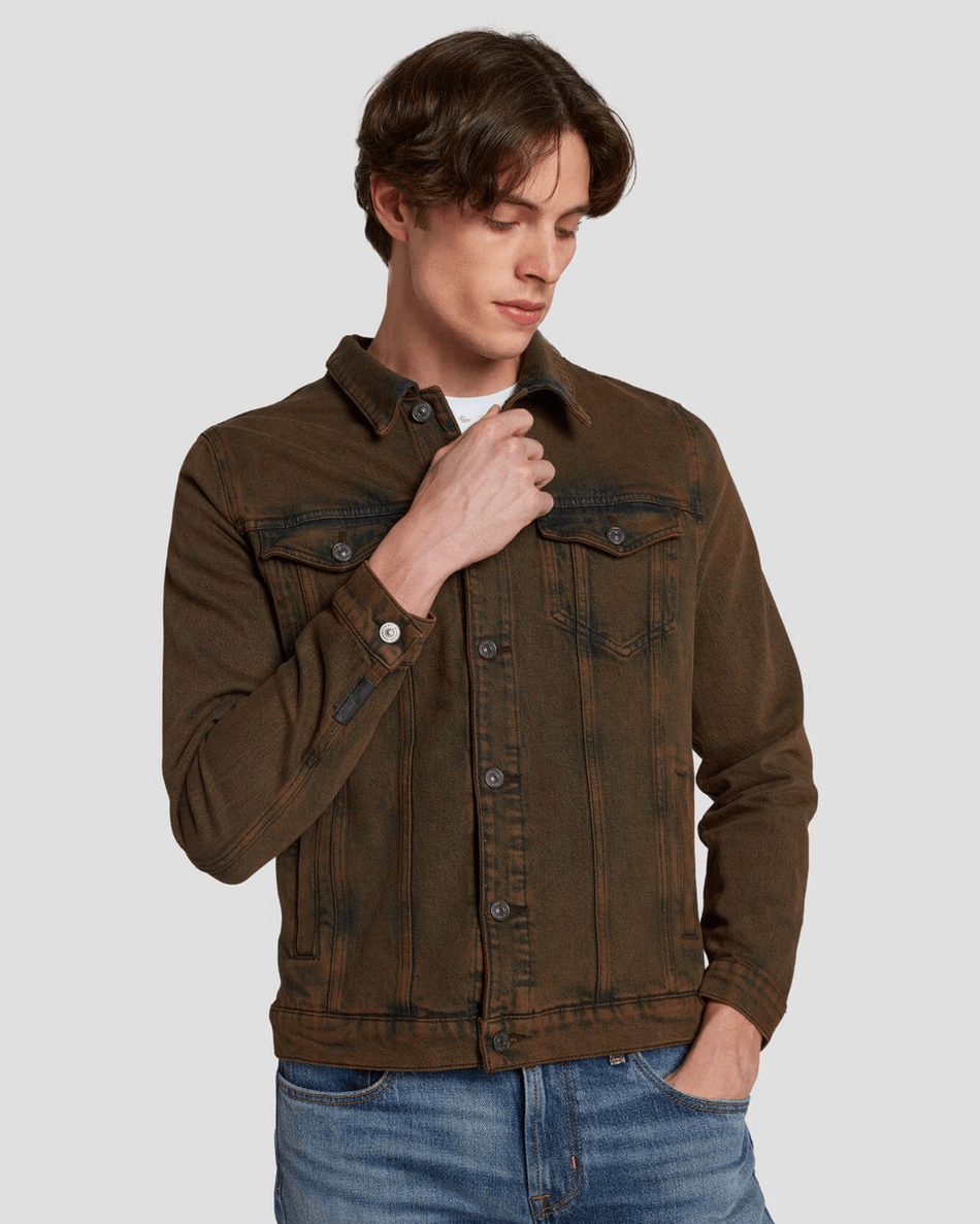Elevate your fall wardrobe with the 7 For All Mankind Perfect Trucker Jacket in Figure Out. This timeless classic is reimagined in a stunning new chestnut hue, perfect for adding a touch of sophistication to your style.