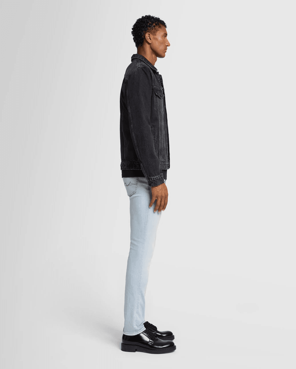 Elevate your style with the 7 For All Mankind Perfect Trucker Jacket in Koto Koto. This classic trucker jacket is designed to offer both comfort and a timeless look that never goes out of fashion. Made from our signature denim, it provides a structured feel that you’ll love to wear every day.
