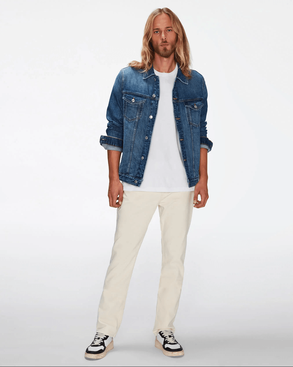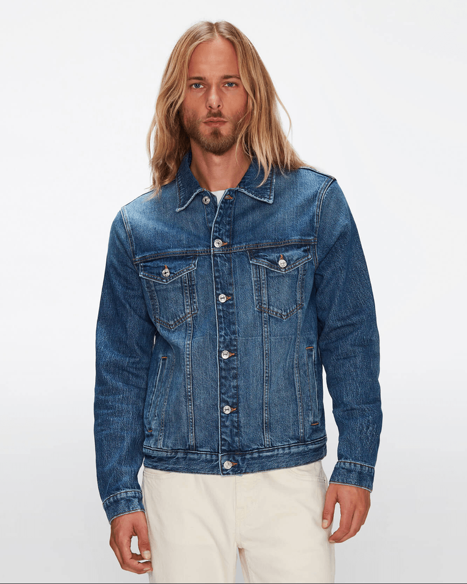 Elevate your off-duty style with the 7 For All Mankind Perfect Trucker Jacket in Lagoon Lagoon. This classic denim trucker jacket is a must-have addition to any modern man’s wardrobe. Its slim-fit design ensures a tailored look while offering comfort and versatility for everyday wear.