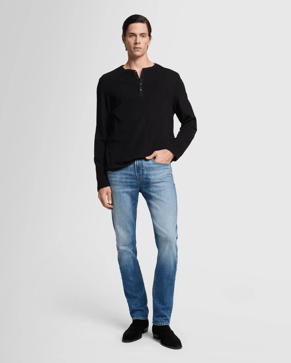 The 7 For All Mankind Airweft Slimmy in Draft Draft is perfect for any occasion, whether you're dressing up for a night out or keeping it casual. The medium blue wash adds a touch of sophistication, while the heavy whiskering and sanding down the thigh create a modern aesthetic. This pair of jeans not only looks great but also offers lasting durability, making them a smart addition to your wardrobe.