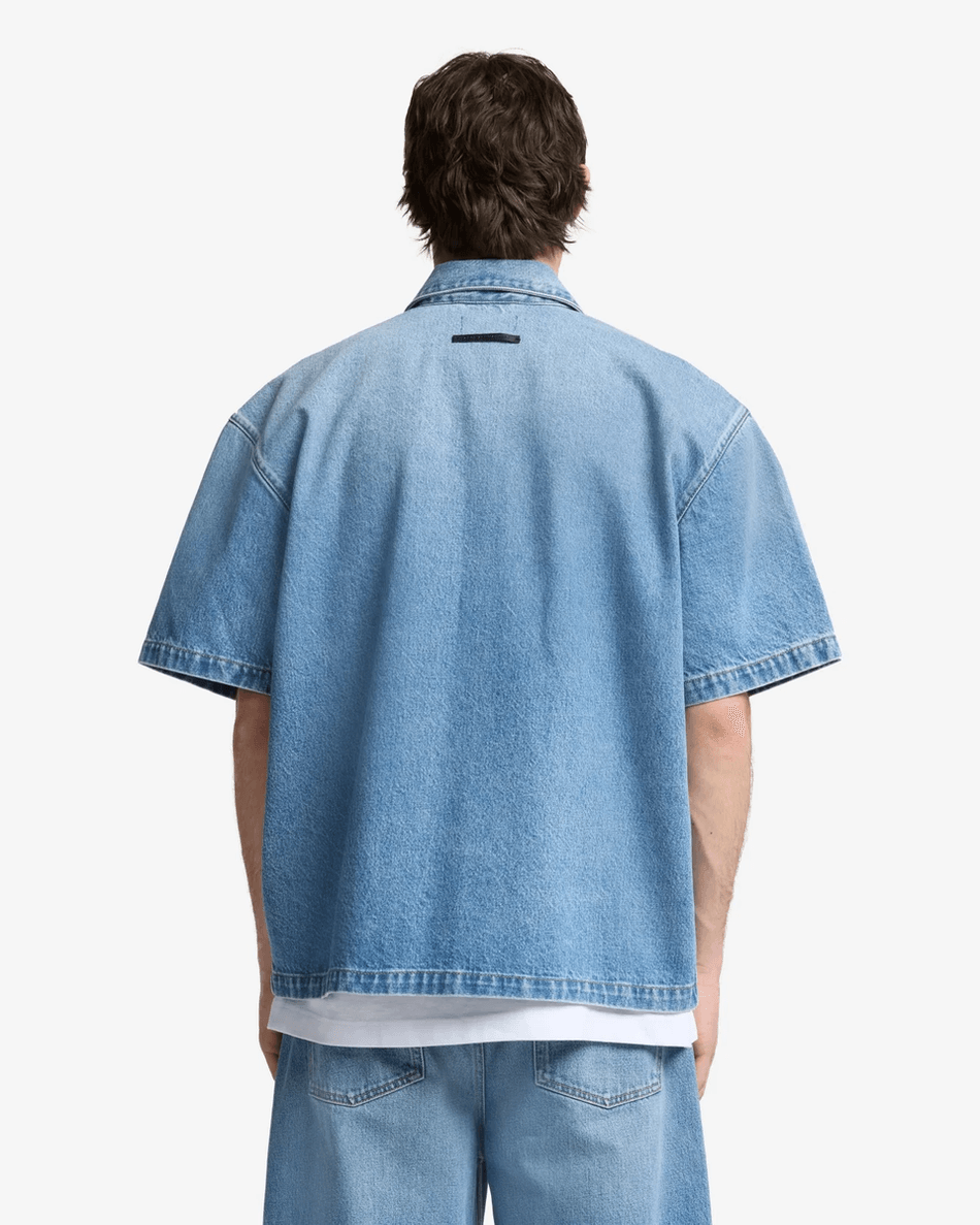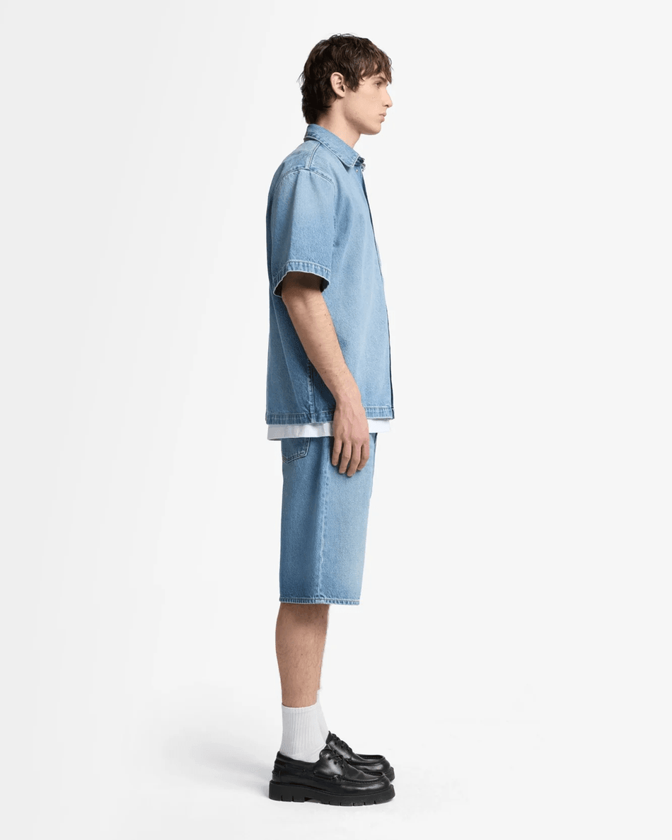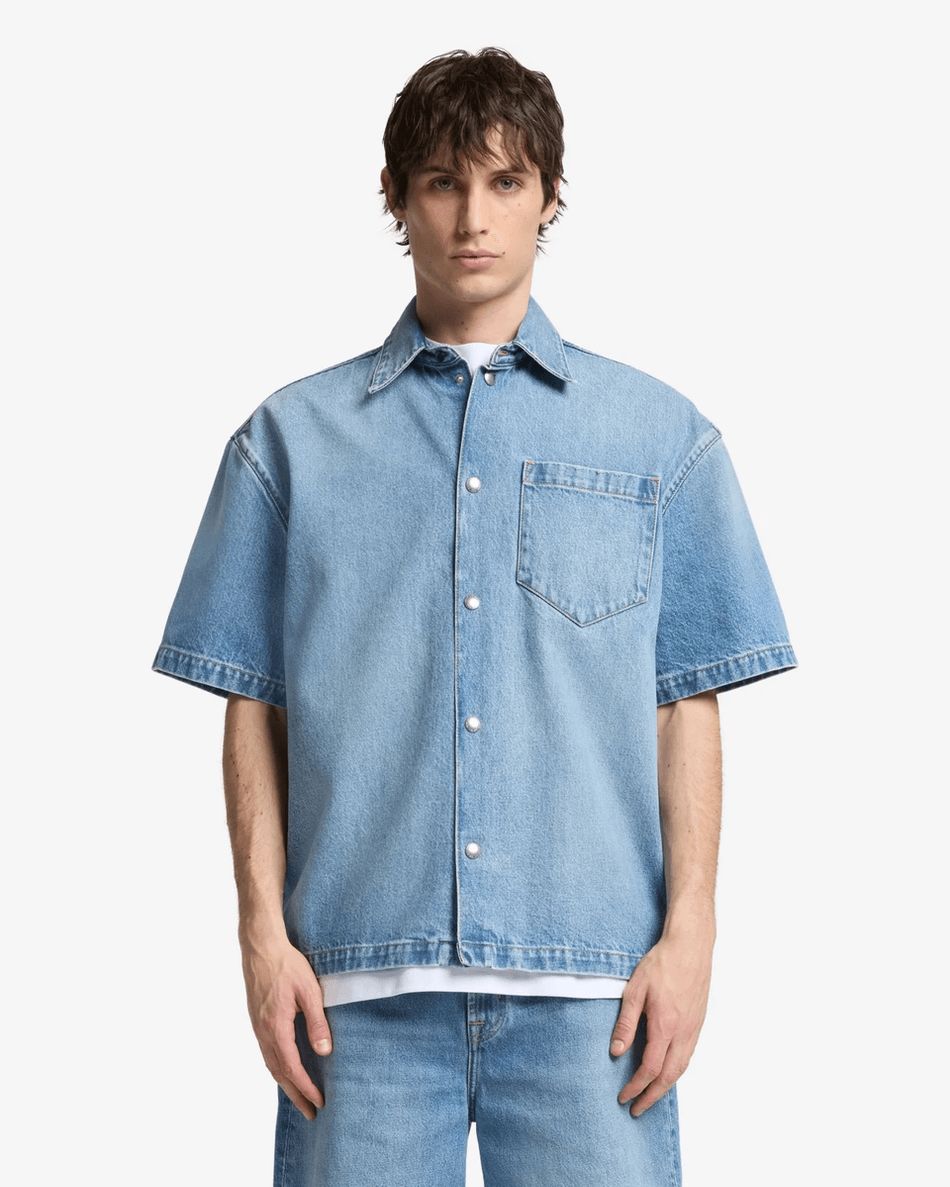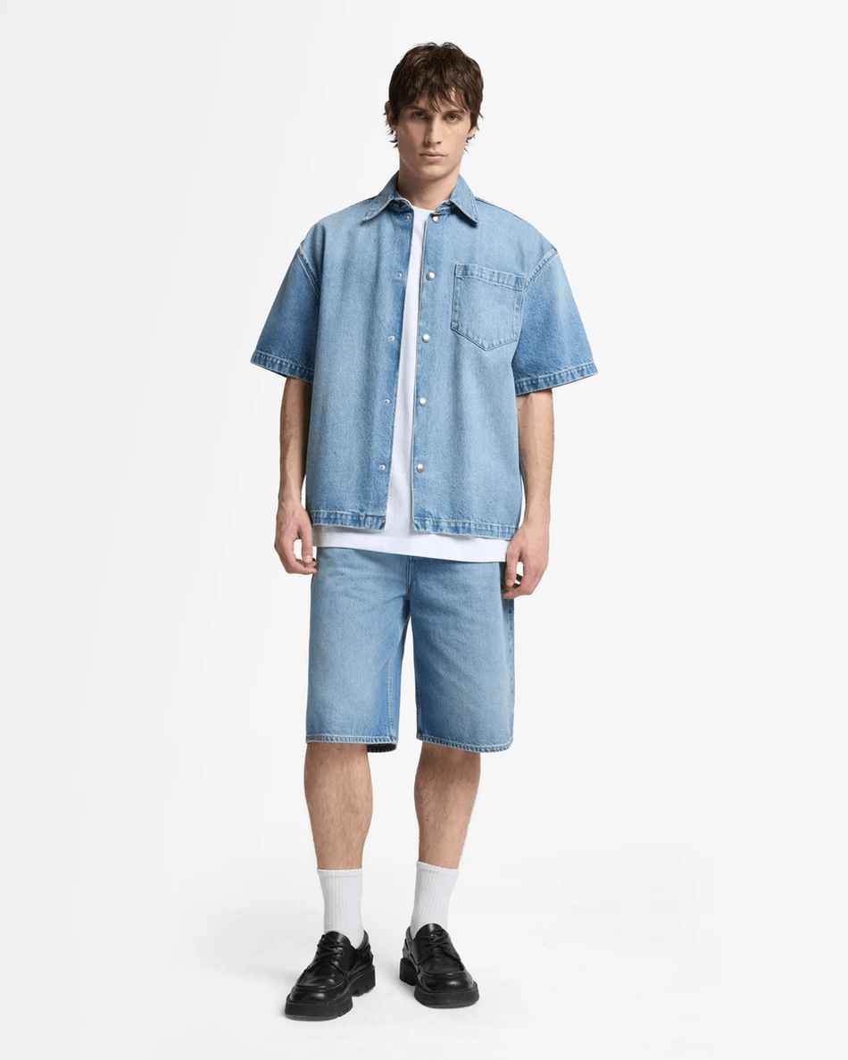 This shirt's classic design pairs well with jeans, shorts, or chinos, making it a versatile choice for any occasion. The rigid denim fabric maintains its shape, ensuring you always look polished.