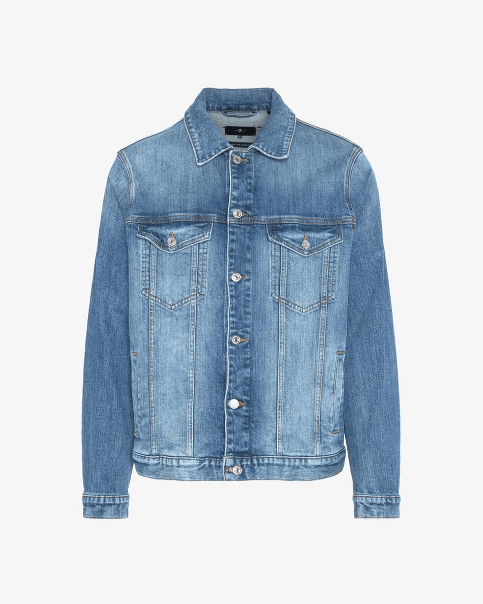 The 7 For All Mankind Multicount Perfect Trucker Jacket In Reason Reason is more than just a jacket; it's a statement piece. Crafted from high-quality denim, it offers a unique tactile experience that redefines classic styles. The long sleeves and button cuffs add a touch of sophistication, making it perfect for both casual outings and dressed-up events.