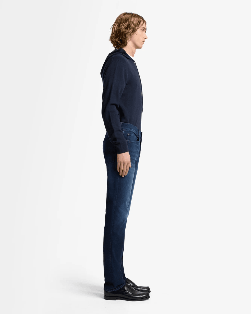 The 7 For All Mankind Slimmy In Ormond combines style and sophistication. Its dark indigo wash provides a polished appearance, making it ideal for both casual outings and more formal gatherings. The heavy whiskering and sanding along the thighs add character, ensuring you stand out from the crowd.