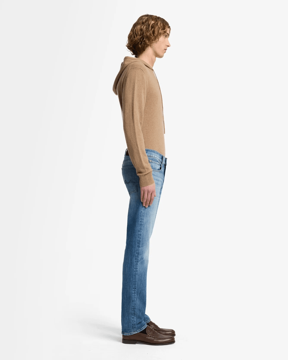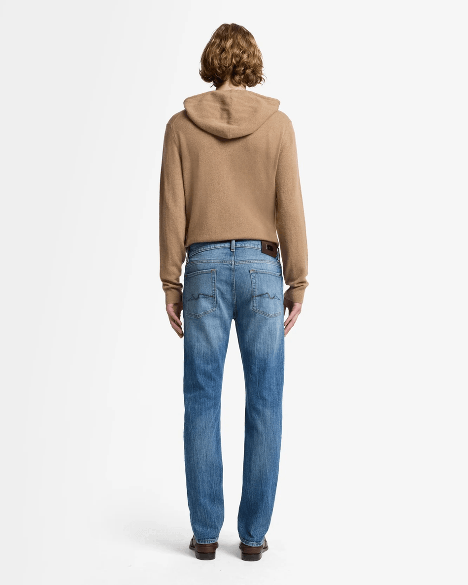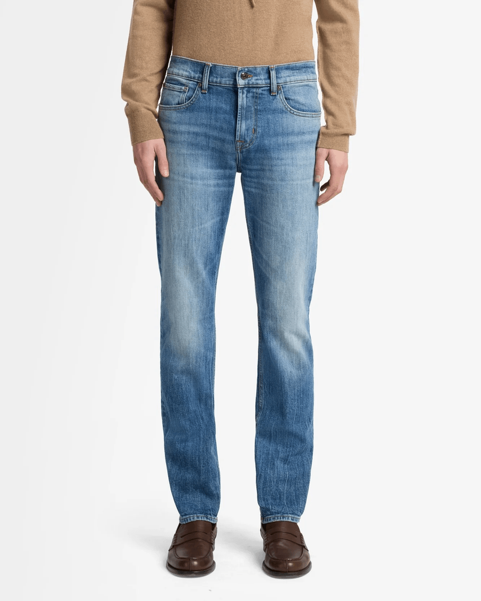 The 7 For All Mankind Special Edition Slimmy in Reason Reason is meticulously crafted for the modern man who values both style and comfort. The medium indigo wash gives you a versatile option for day or night, while the heavy whiskering and sanding add character to your look. The contrast stitching not only enhances durability but also sets this jean apart from the rest.