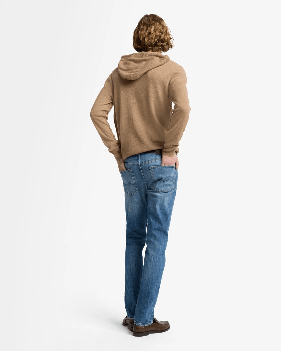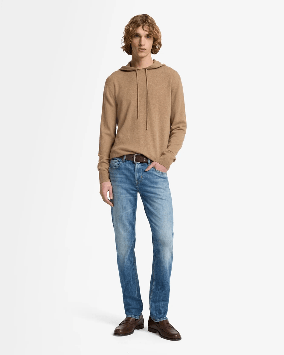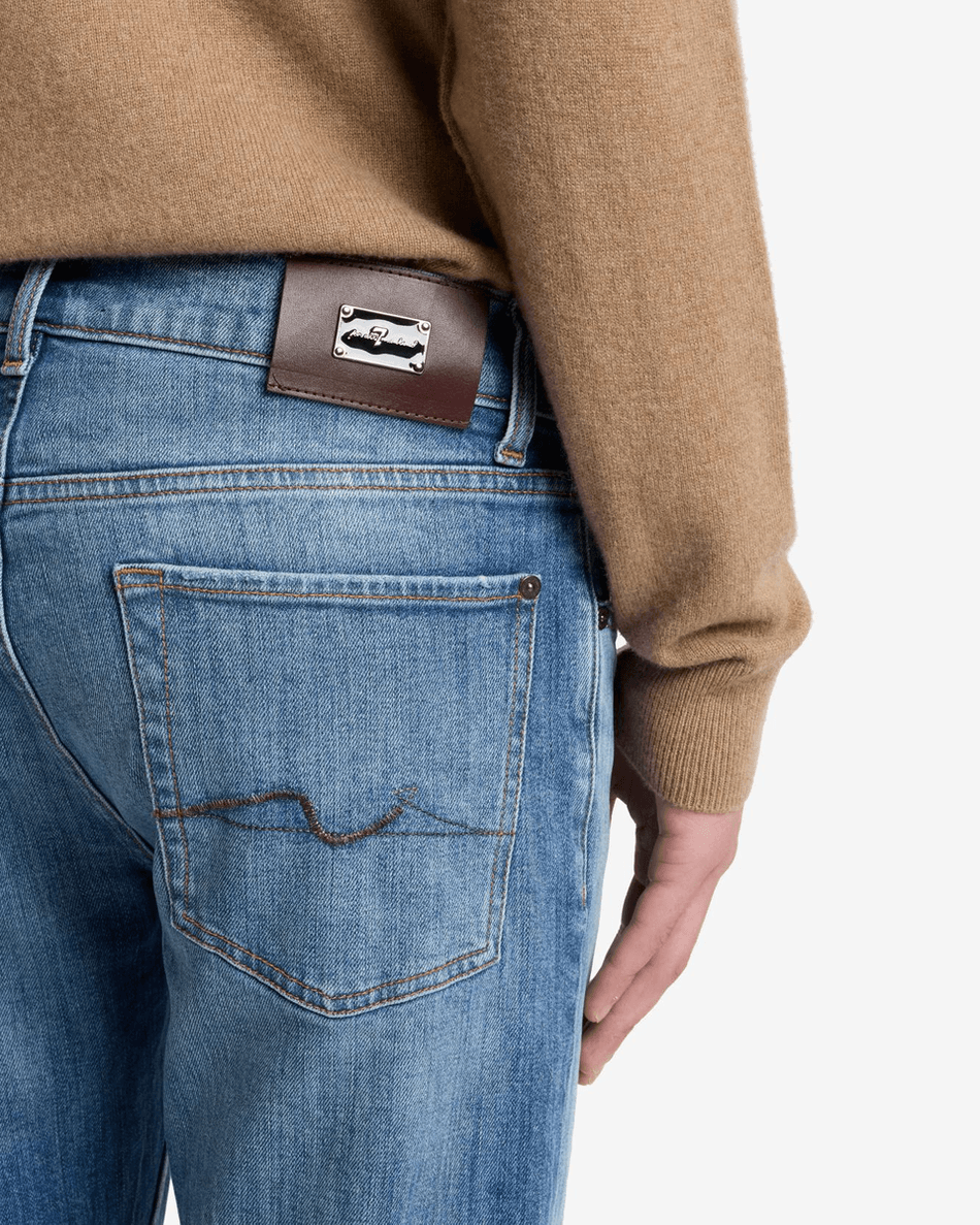The 7 For All Mankind Special Edition Slimmy in Reason Reason is meticulously crafted for the modern man who values both style and comfort. The medium indigo wash gives you a versatile option for day or night, while the heavy whiskering and sanding add character to your look. The contrast stitching not only enhances durability but also sets this jean apart from the rest.