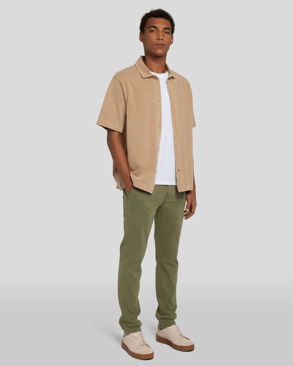 Elevate your wardrobe with the 7 For All Mankind Button Down Mineral Dye Polo in Sand Sand. This timeless classic is perfect for any season, blending style and sustainability effortlessly.