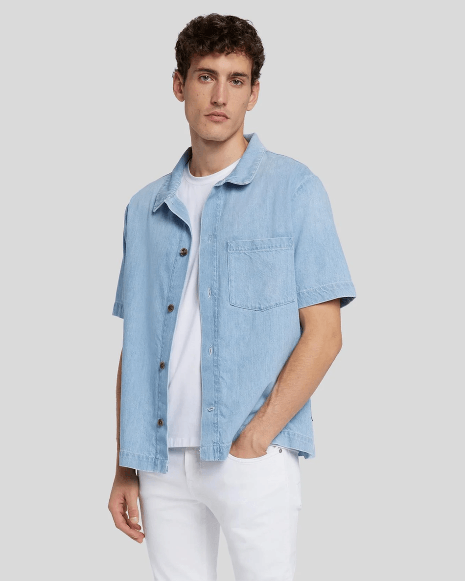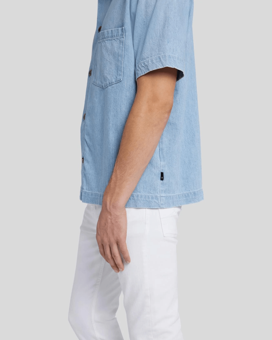 The 7 For All Mankind Denim Camp Shirt in Azure Azure is more than just a basic; it's a wardrobe essential. Whether you're heading to a casual brunch, a beach day, or simply lounging at home, this shirt offers endless styling possibilities. Pair it with your favorite jeans for a laid-back vibe or dress it up with chinos for a night out.