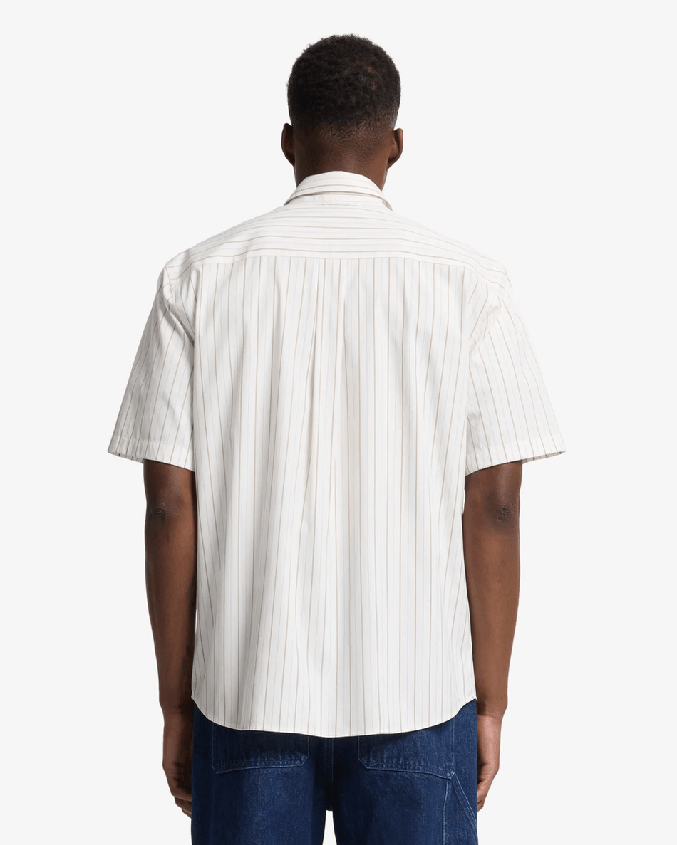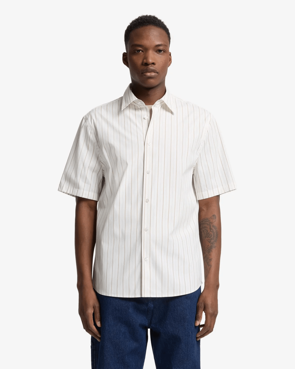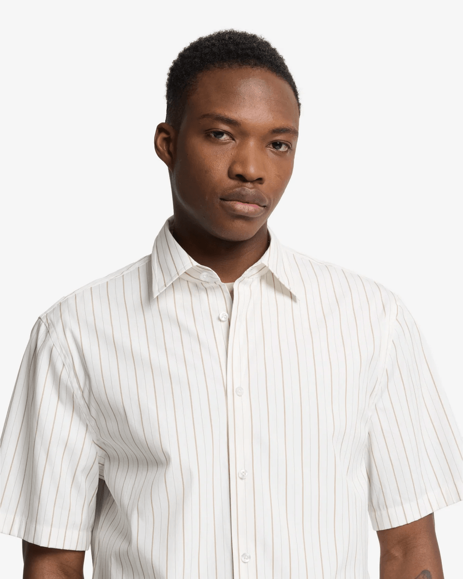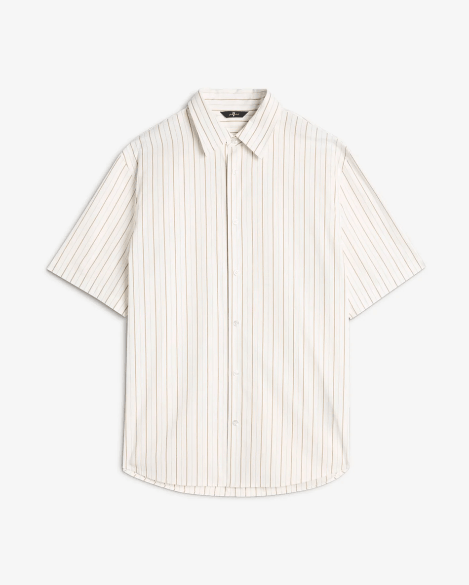 Discover the 7 For All Mankind Short Sleeve Poplin Shirt in Beige Stripe