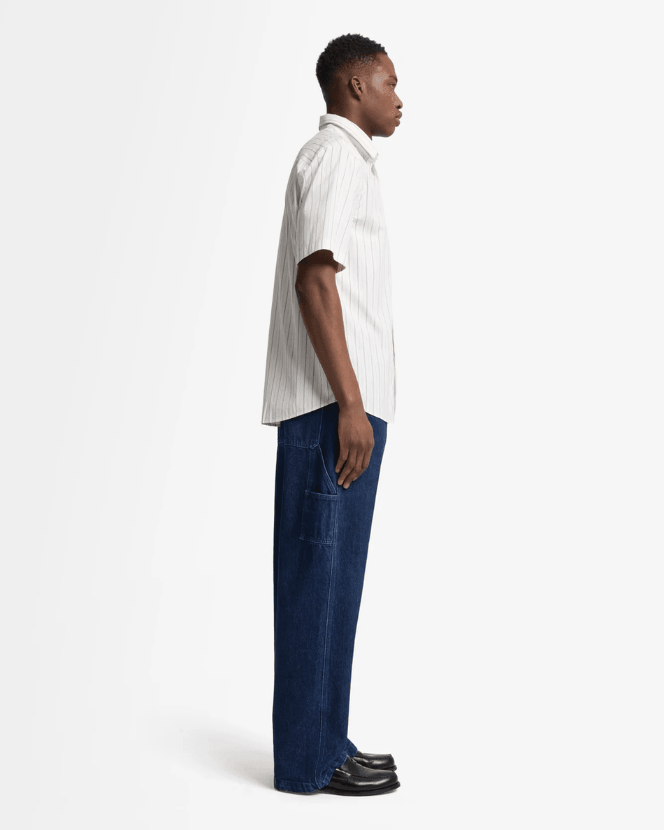 The 7 For All Mankind Short Sleeve Poplin Shirt in Beige Stripe features a classic point collar and a button-up front, making it perfect for both work and play. Pair it with chinos for a polished look or with shorts for a laid-back vibe. The short sleeves provide easy movement, while the crisp cotton ensures you stay comfortable and stylish all day long.