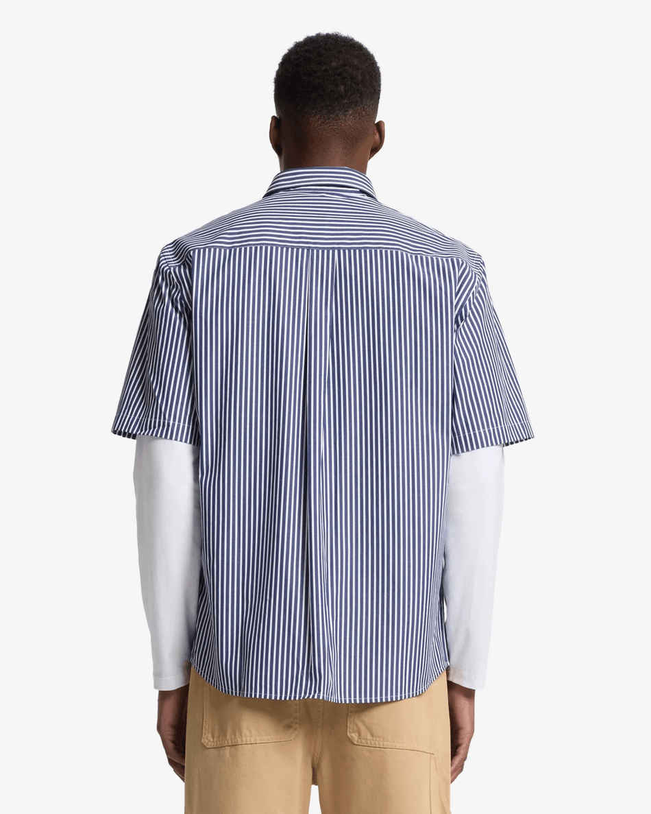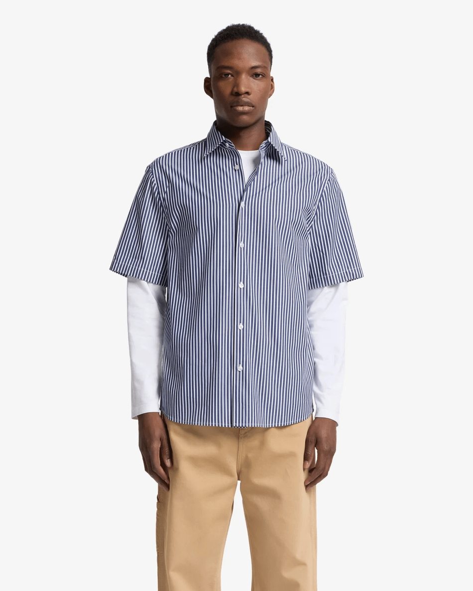 Elevate your wardrobe with the 7 For All Mankind Short Sleeve Poplin Shirt in Navy Stripe. This stylish shirt combines a tailored yet relaxed fit, making it the perfect choice for both casual outings and smart-casual events. Experience the crisp, cool feel of this premium shirt that effortlessly drapes on your body.