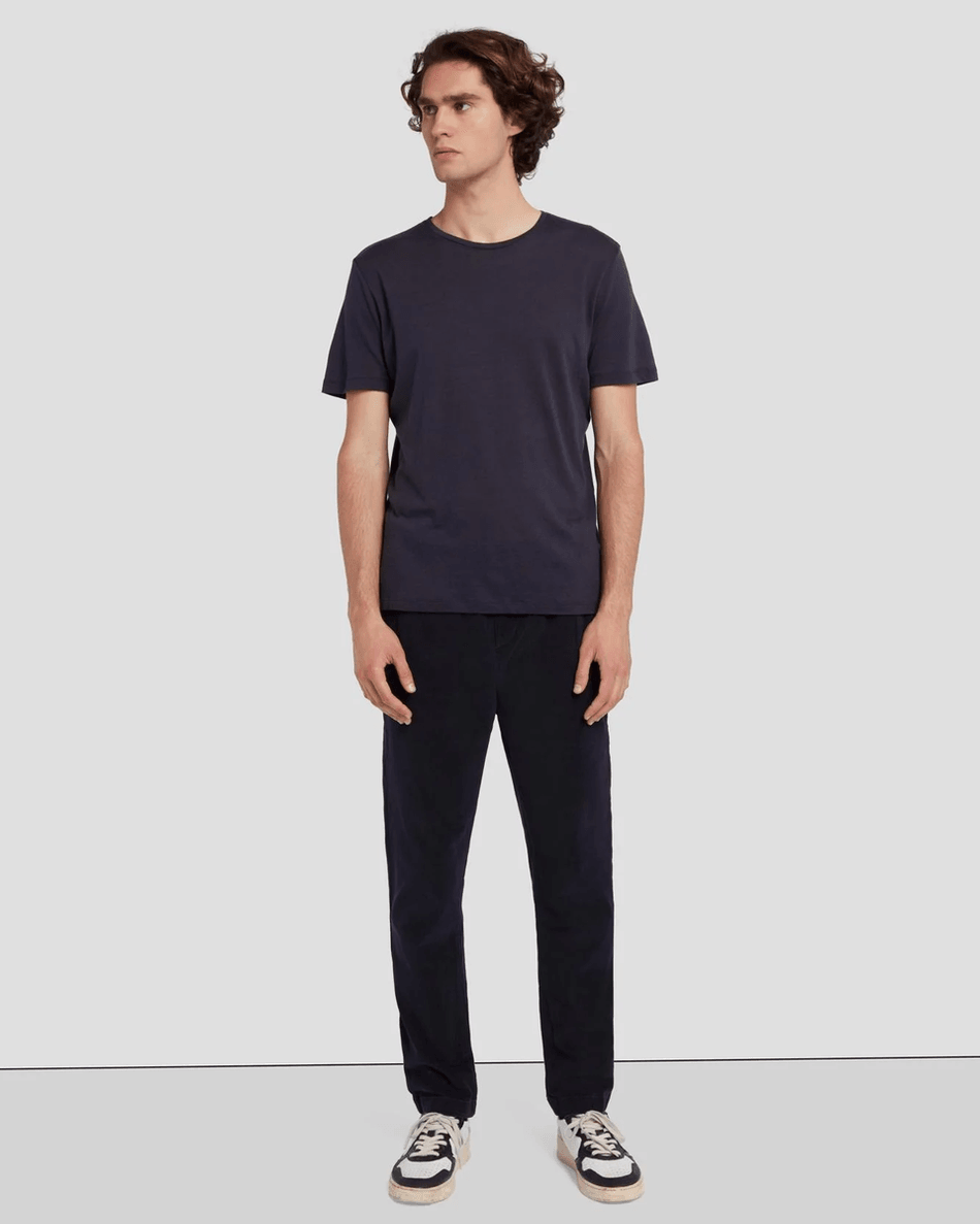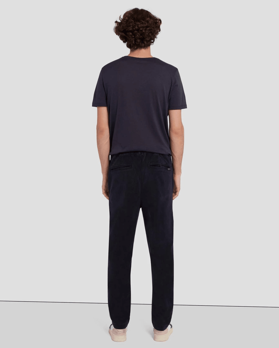 Experience the perfect blend of style and comfort with the 7 For All Mankind Warm Twill Jogger in Navy. This innovative tapered-leg pant combines the sophisticated look of chinos with the laid-back feel of joggers, making it a must-have for every wardrobe.