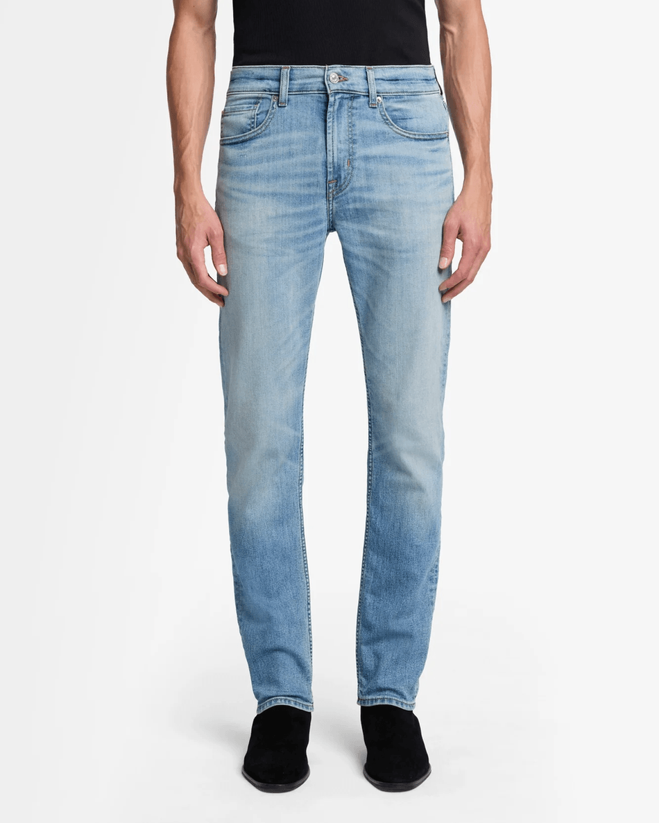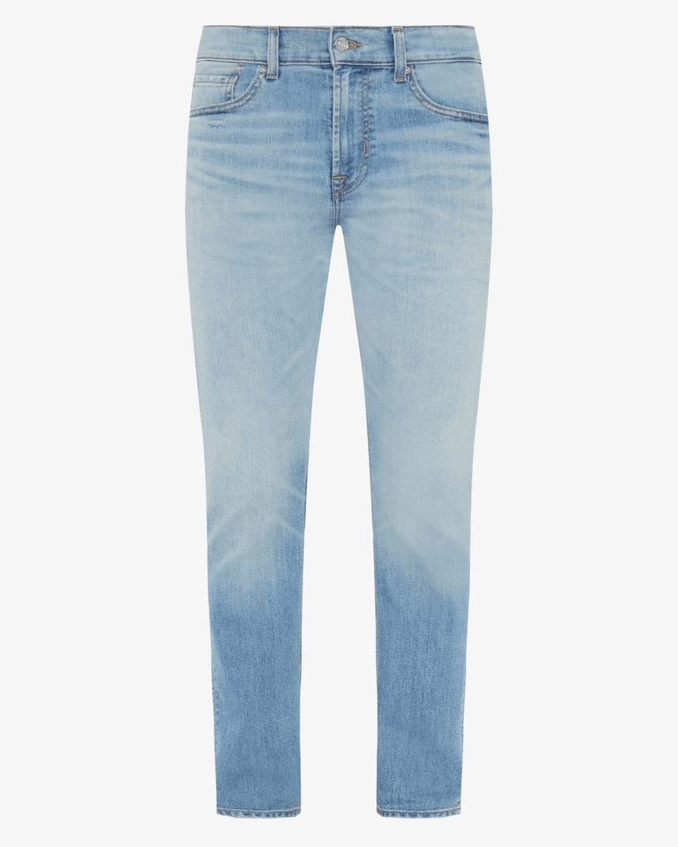 verhoog Je Denimspel Met De 7 For All Mankind Airweft Slimmy In Legato Legato. Deze Lichtblauwe Jeans Zijn Ontworpen Om Een Moderne Slim-fit Van Heup Tot Zoom Te Bieden, Wat Zorgt Voor Een Slanke Silhouet Die Bij Elke Outfit Past. Ervaar De Perfecte Mix Van Stijl En Comfort Met Deze Premium Jeans.