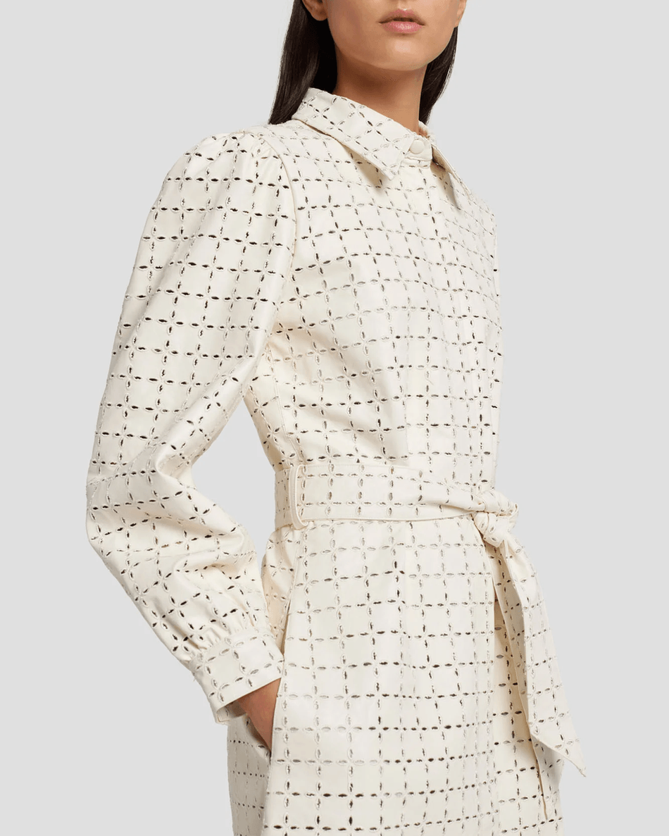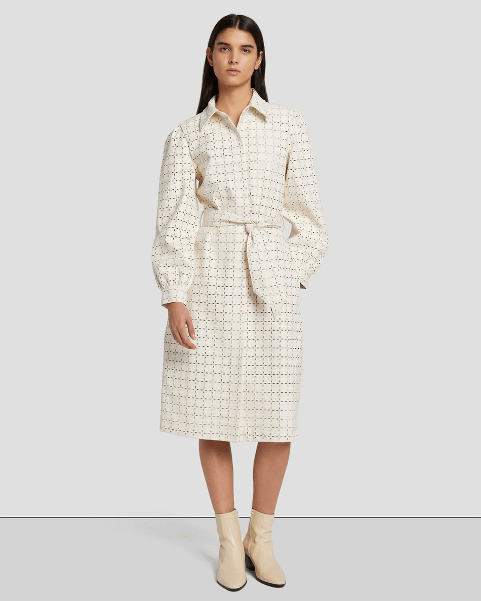 The 7 For All Mankind Faux Leather Belted Shirt Dress in Cream is meticulously designed for the fashion-forward individual. Its self-tie feature offers a customizable fit that flatters every body type. The eyelet detailing not only enhances its aesthetic appeal but also adds breathability, making it suitable for various occasions.