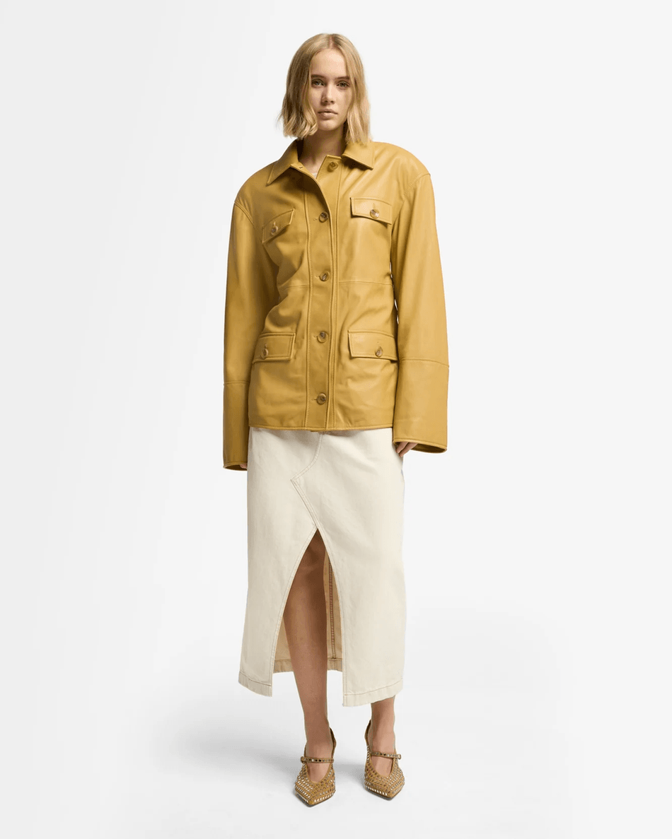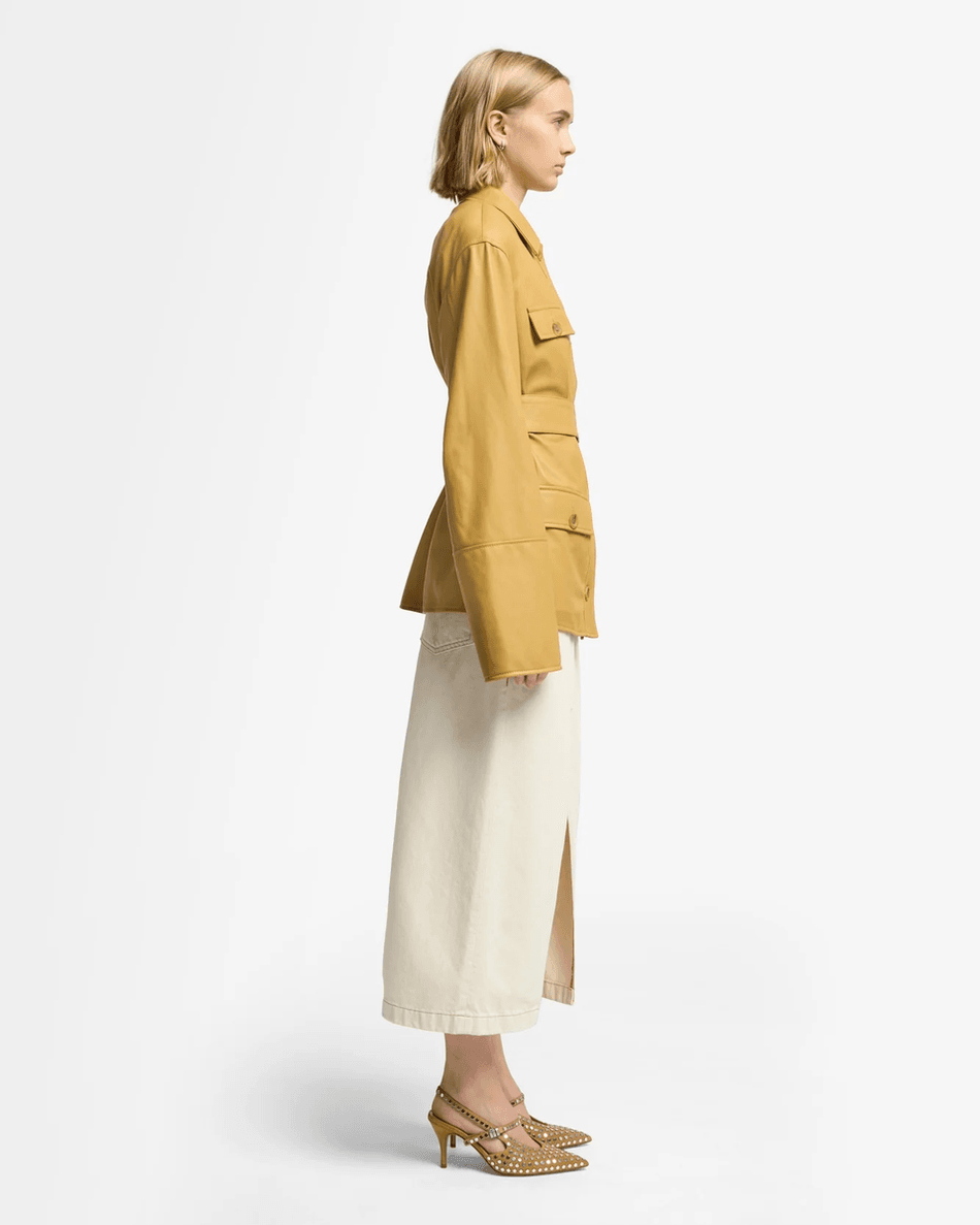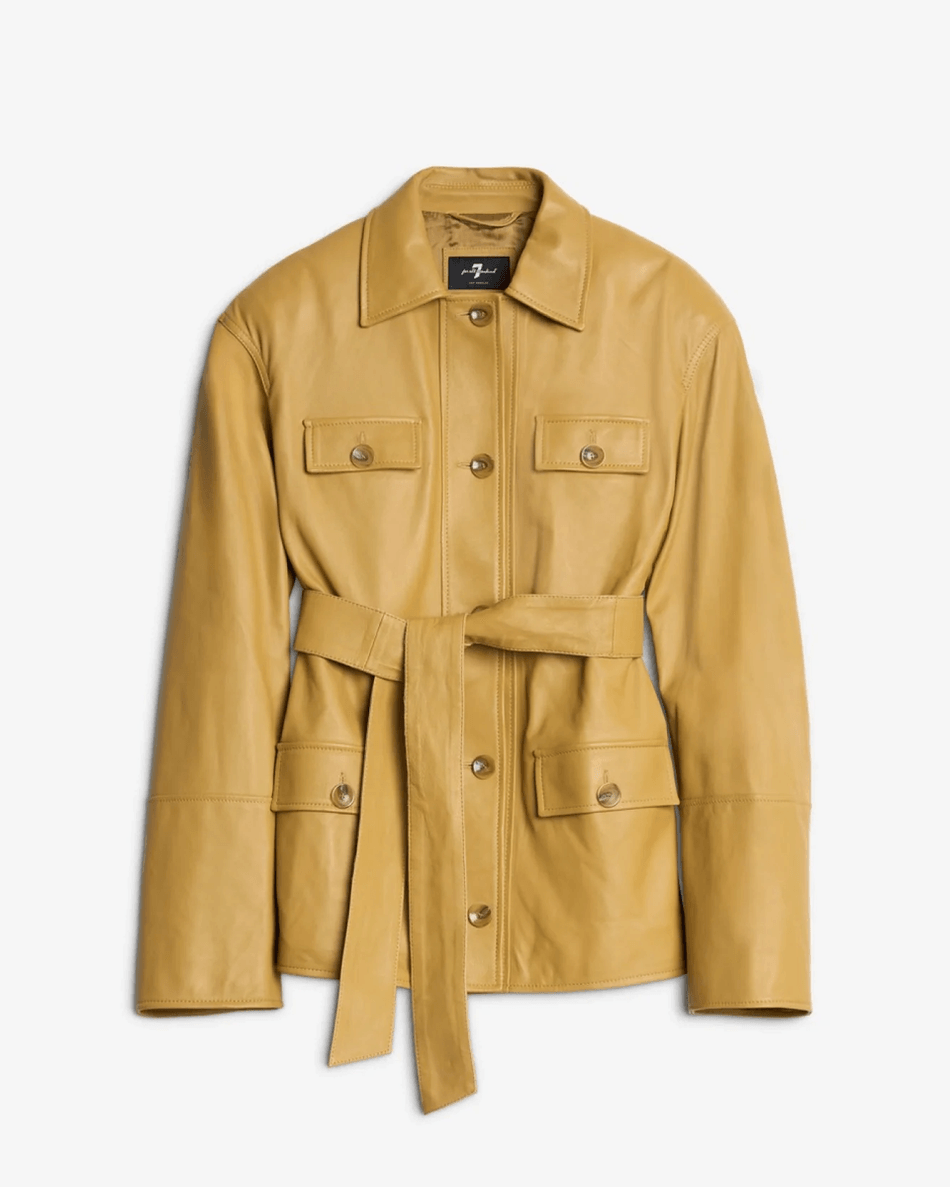 Elevate your outerwear collection with the 7 For All Mankind Sahariana Leather Cropped Trench in Honey Honey. This luxurious jacket combines classic sahariana styling with modern elegance, offering a tailored yet relaxed fit that flatters every silhouette.