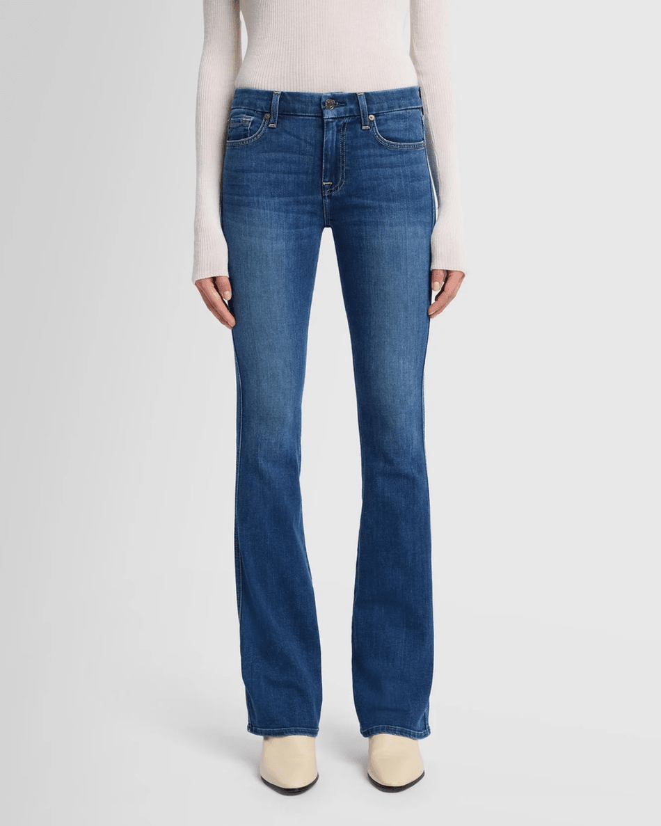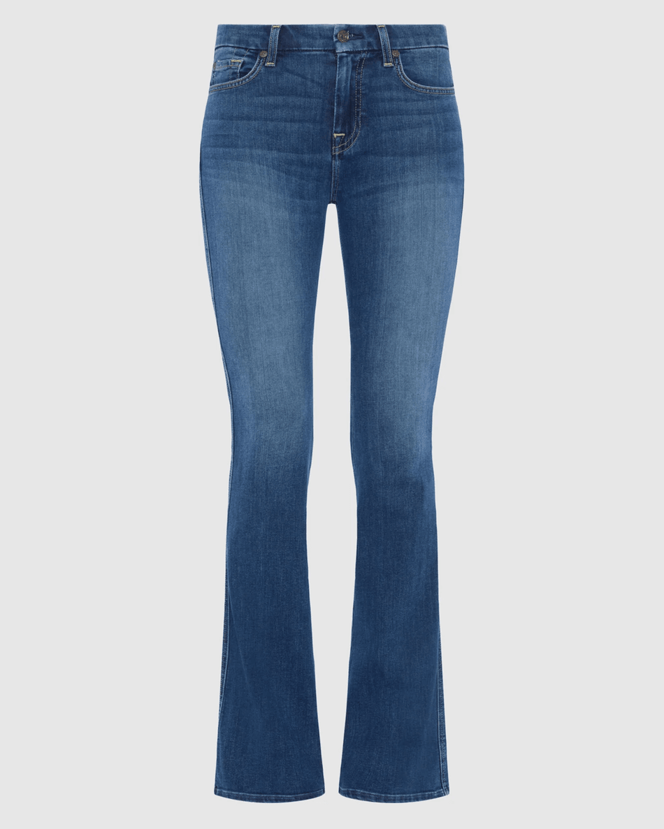 Elevate your denim collection with the 7 For All Mankind 'A' Pocket in Anthem Blue. These exquisitely crafted bootcut jeans are designed to provide a stunning silhouette that flatters every figure. With a mid-rise fit that hugs your hips and thighs, these jeans gradually flare from the knee for a graceful leg shape.