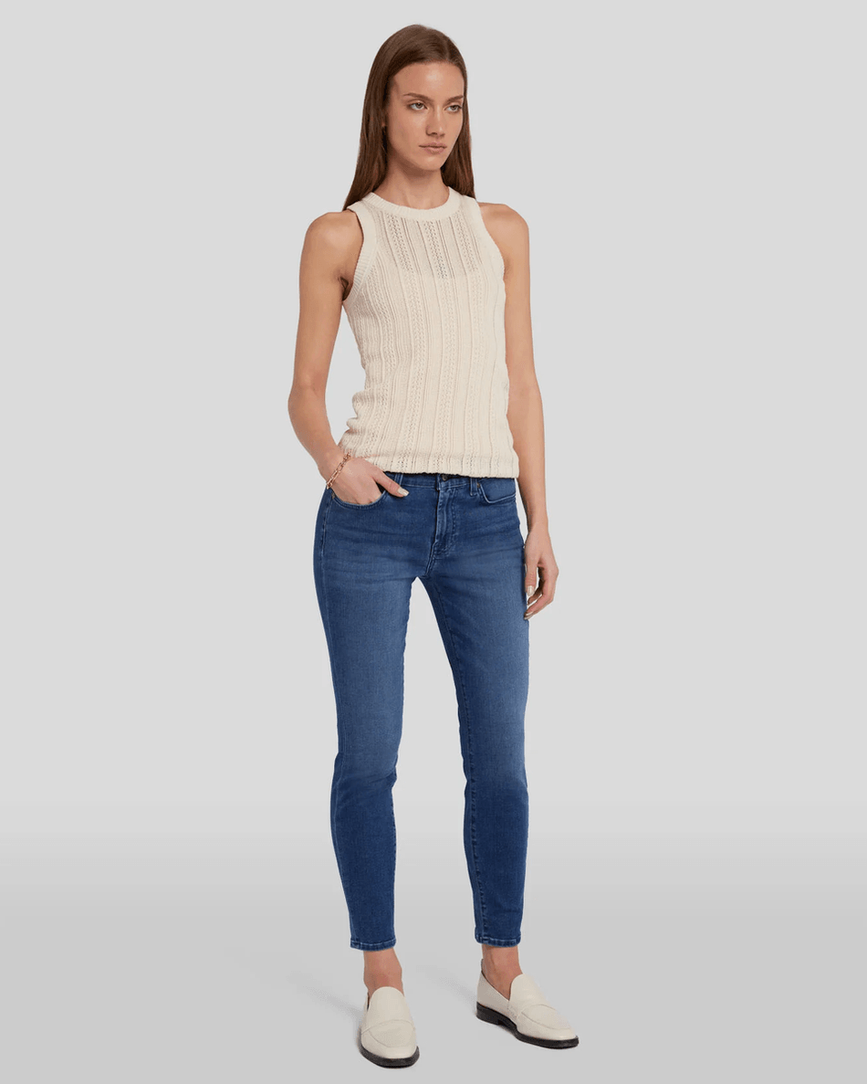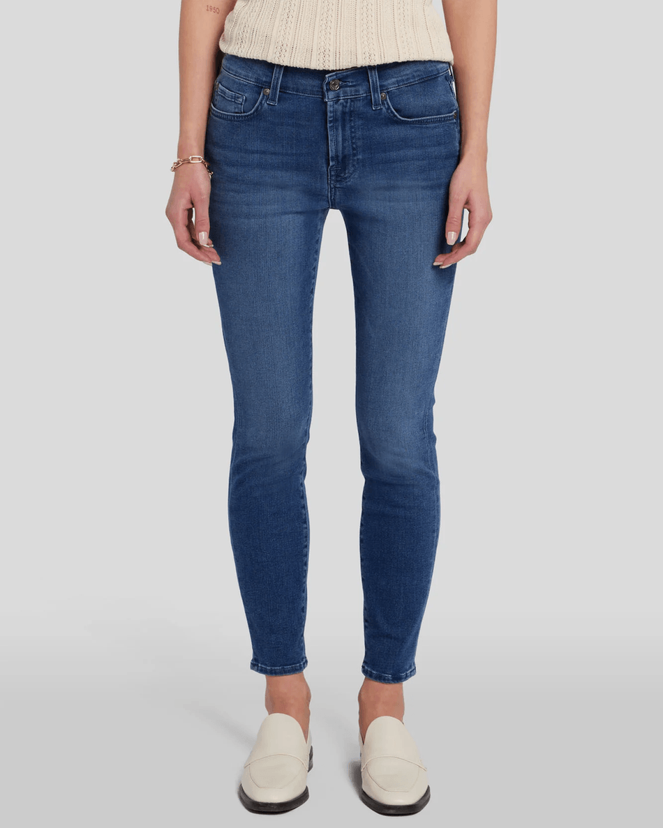 Elevate your wardrobe with the 7 For All Mankind B(air) Ankle Skinny in Virtual Virtual. This classic, mid-rise skinny fit is designed to provide the ultimate comfort and style. Made from our ultra-light B(air) stretch denim, these jeans feel as good as they look.