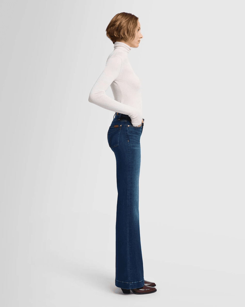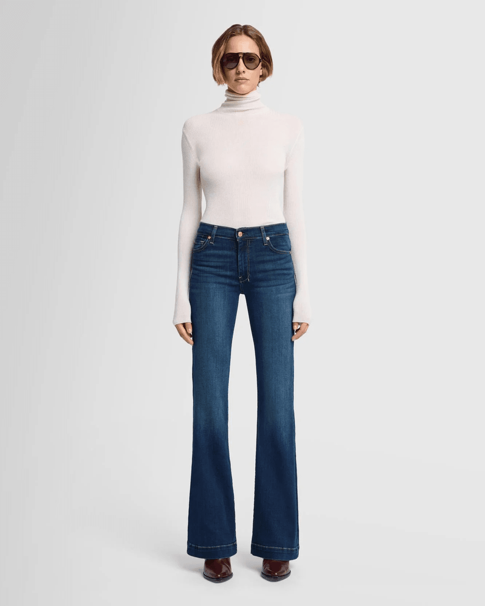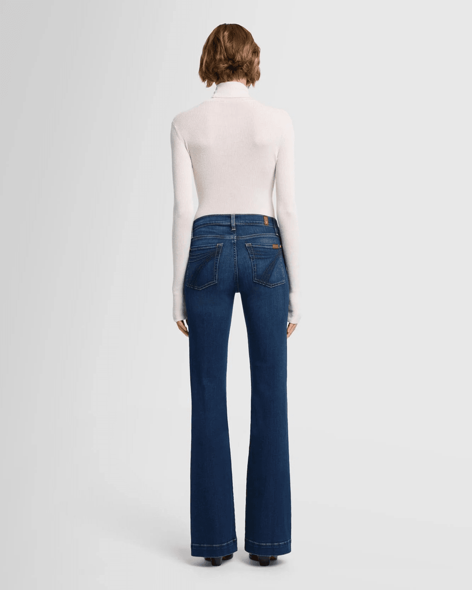Elevate your wardrobe with the 7 For All Mankind B(air) Authentic Denim Dojo in Fate. This best-selling denim style is crafted in a timeless dark wash, perfect for any occasion. Experience a flattering fit that hugs your hips and thighs, transitioning to a subtle flare that creates an elongated silhouette.
