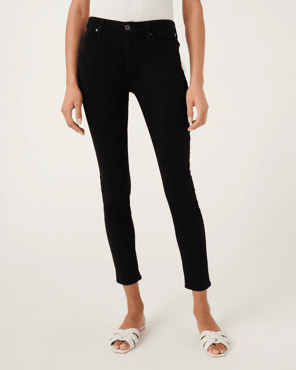 Revamp your wardrobe with the 7 For All Mankind B(air) Denim Ankle Skinny in Black. This stylish piece combines unparalleled comfort with a sleek design, making it the perfect addition to any fashion-forward outfit.