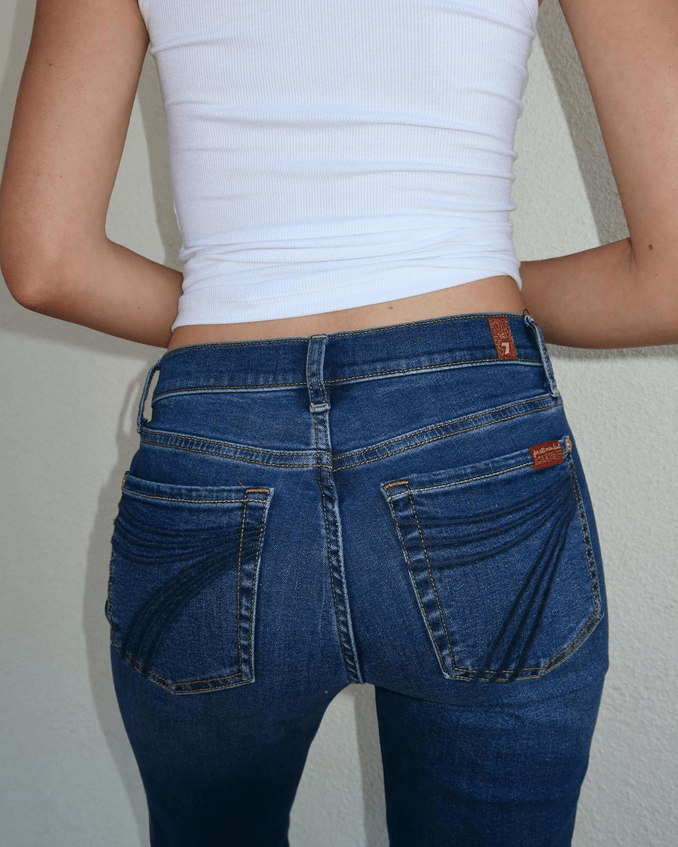 Elevate your denim collection with the 7 For All Mankind B(air) Dojo in Medium Melrose. This stylish mid-rise pant combines comfort and sophistication, perfect for any occasion. Experience a fitted silhouette that enhances your curves while providing ultimate comfort.