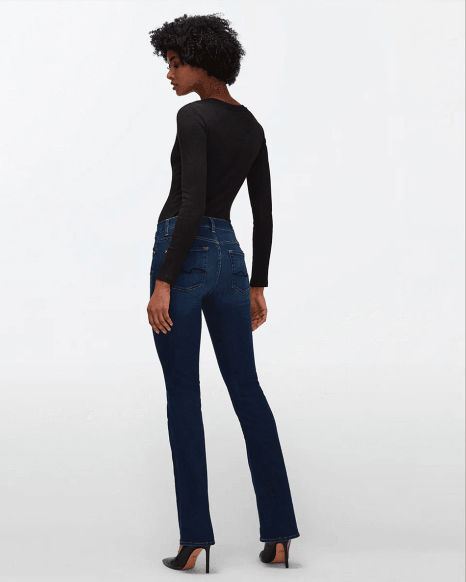 Elevate your denim collection with the 7 For All Mankind B(air) Embellished Kimmie Bootcut in Rinsed Indigo. This stylish bootcut jeans features a classic silhouette and a mid-rise waist, perfect for any occasion. The dark wash and embellished back pocket add a touch of sophistication, making it a must-have for your fall wardrobe.