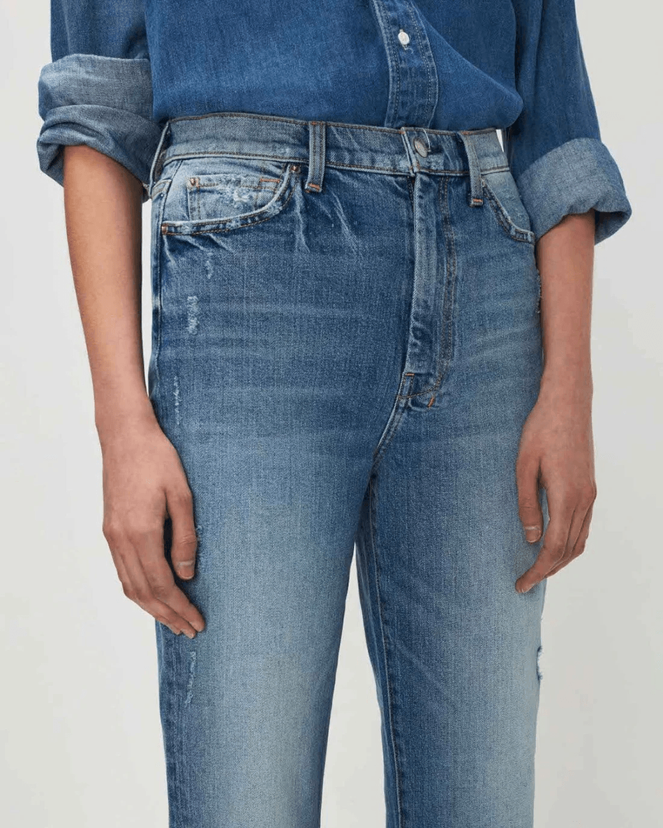 The 7 For All Mankind Beauty Denim Ultra High Rise Dojo in Fig Leaf is designed for those who value both style and comfort. The unique blue hue is enhanced with fashionable whiskering and fading, giving you that effortlessly chic vibe. The stretch fabric is perfect for all-day wear, allowing you to move freely without sacrificing style.