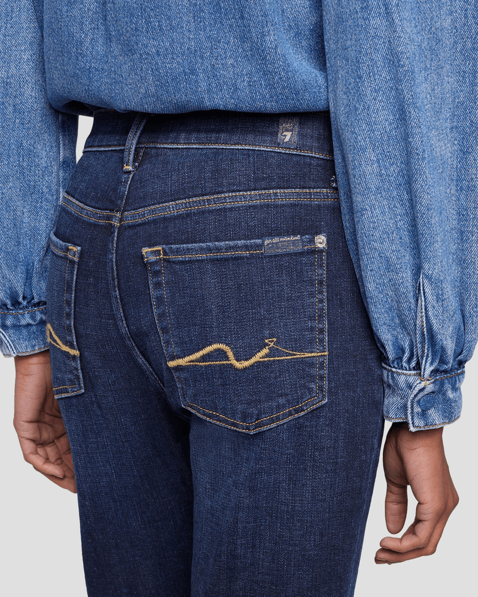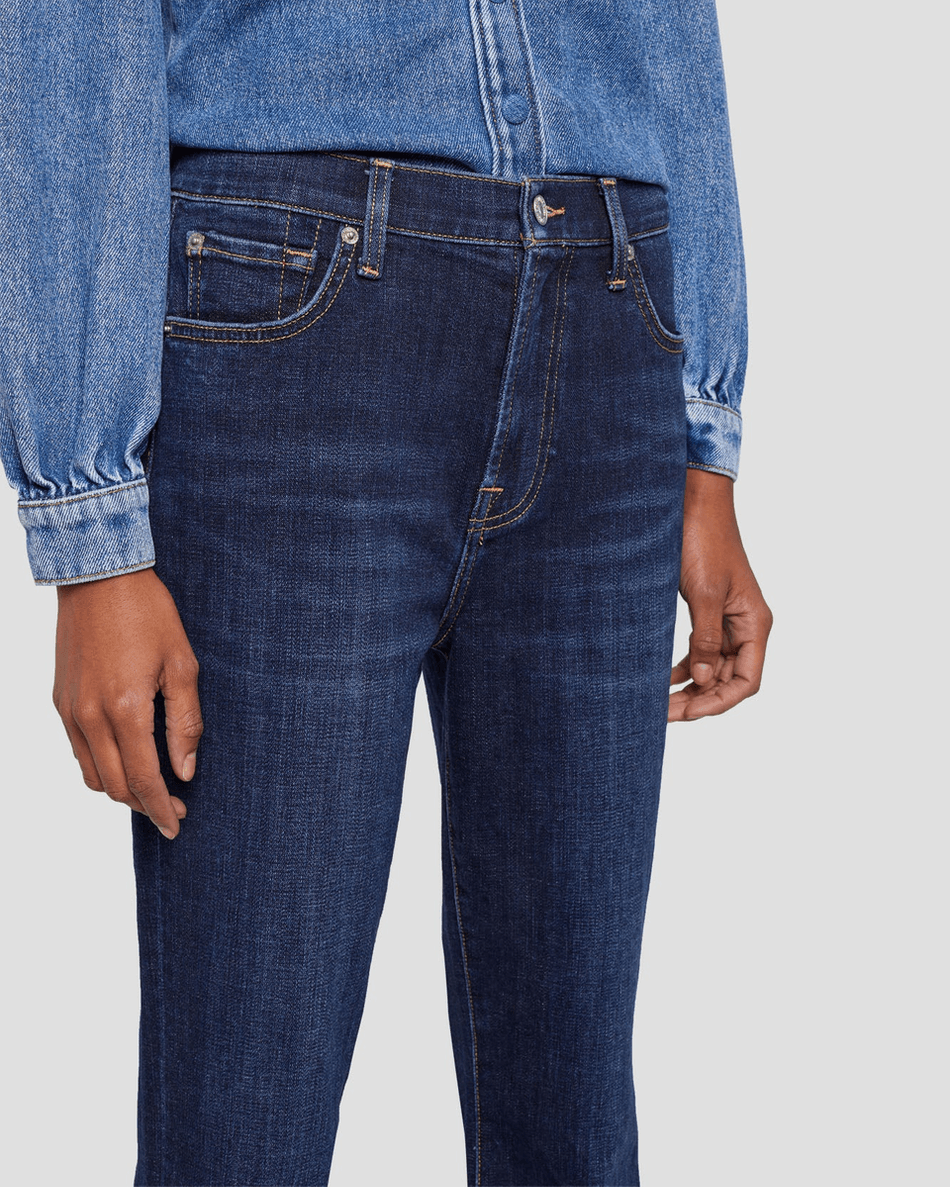 The 7 For All Mankind Broken Twill High Waist Slim Kick in Calix is crafted from a luxurious broken twill fabric that ensures both comfort and durability. The medium stretch denim allows for ease of movement while maintaining a tailored look. The dark wash finish not only offers a sophisticated vibe but also makes these jeans easy to pair with various tops.