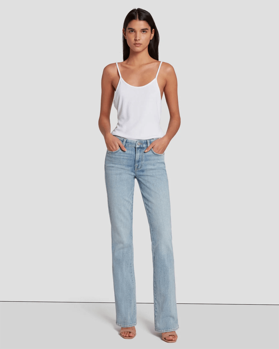 Elevate your denim collection with the 7 For All Mankind Broken Twill Kimmie Bootcut in Coco Prive. This stylish mid-rise bootcut jean is designed for the modern woman who values both comfort and sophistication. Experience a snug fit that gracefully flares below the knee, perfect for any occasion.