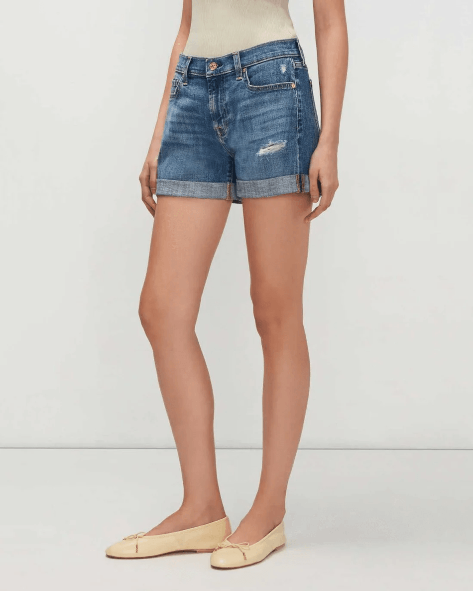 Step into summer with style in the 7 For All Mankind Broken Twill Mid Roll Short in Bright Light Destroy. These classic denim shorts are designed for the modern woman who values comfort and fashion. With their mid-rise and relaxed fit, they offer the perfect balance of ease and chic.