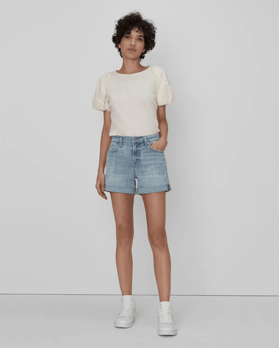 The 7 For All Mankind Broken Twill Mid Roll Short In Coco Prive Destroy combines a faded blue wash with sophisticated detailing. Perfect for a sunny day out, these shorts can effortlessly be styled with a classic button-up shirt or a relaxed tee for a versatile, elevated casual outfit. The comfortable stretch fabric ensures you can enjoy your day without feeling restricted.