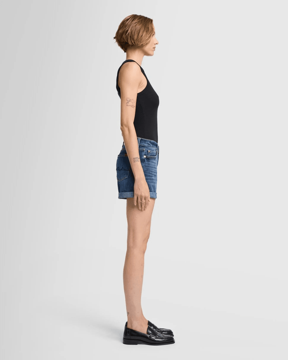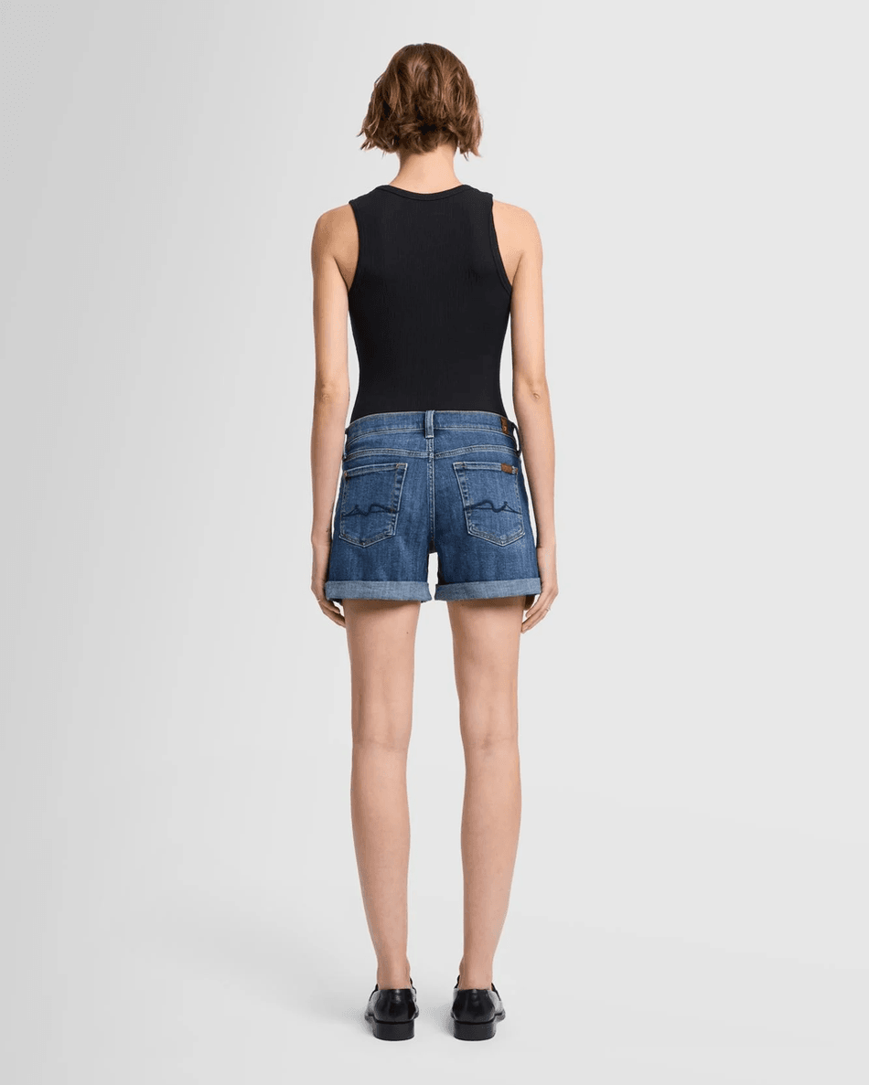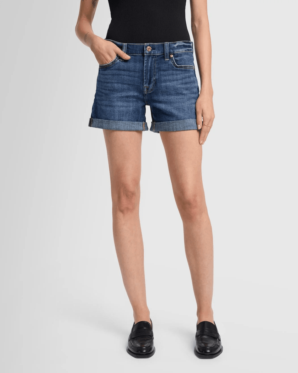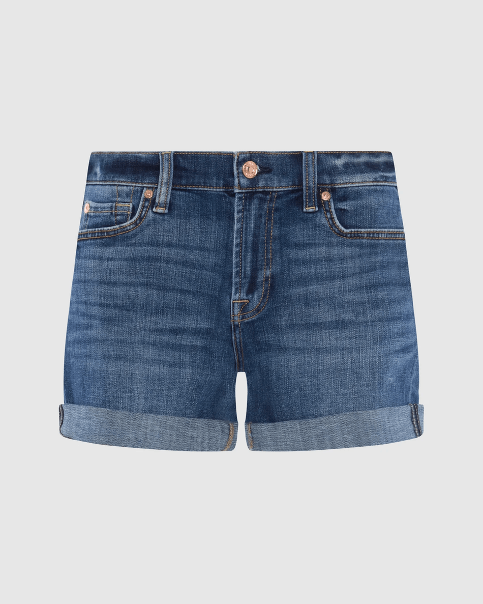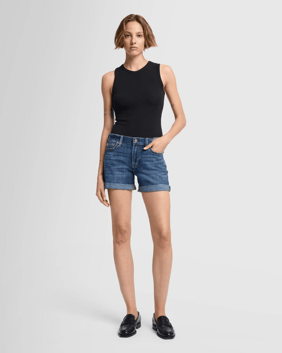 The 7 For All Mankind Broken Twill Mid Roll Short in Vanity Vanity is expertly crafted from our signature premium denim, ensuring a flattering fit that moves with you. The lightly faded, medium blue wash adds a timeless touch, making these shorts an essential addition to your closet. With a cuffed hem, they offer a clean finish that pairs well with any top.