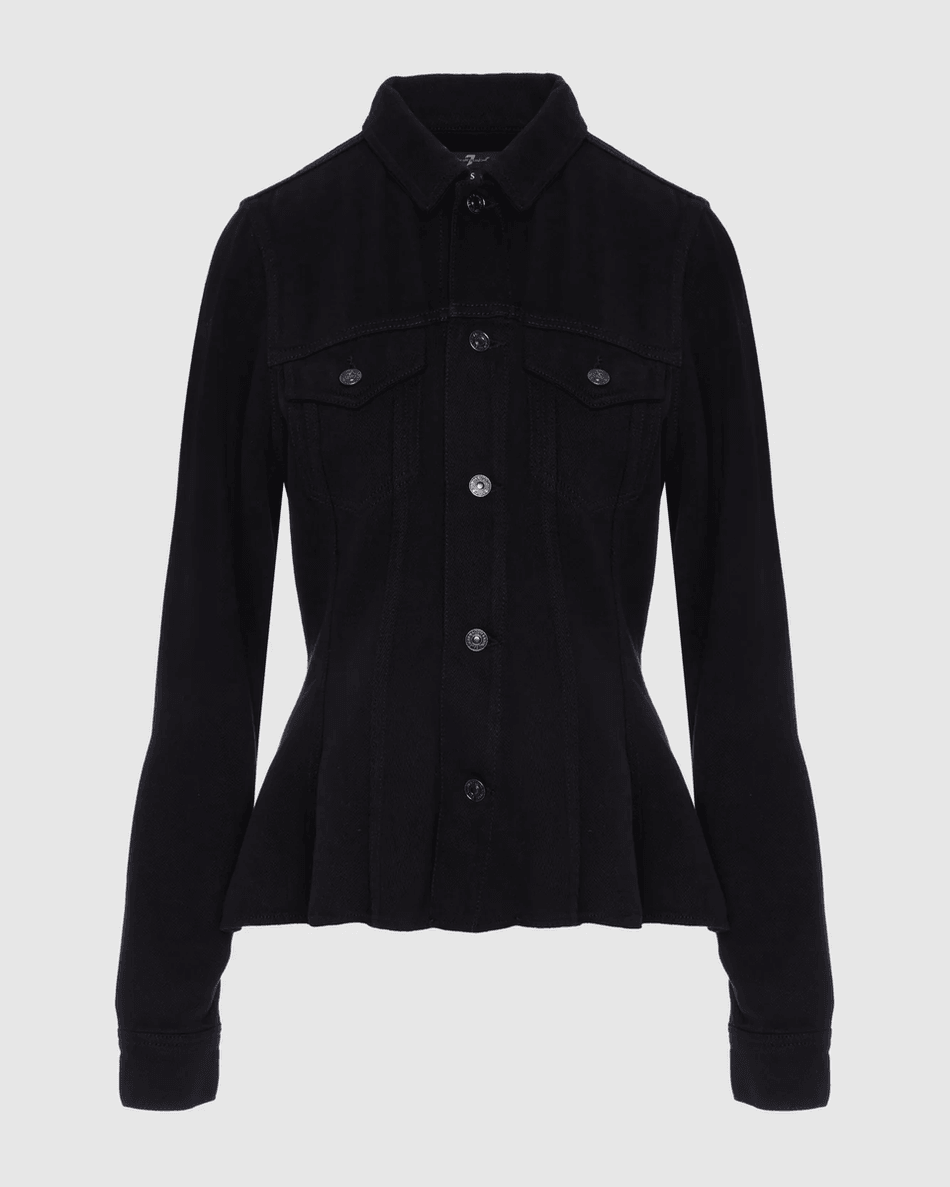 Elevate your wardrobe with the 7 For All Mankind Denim Lustre Flounce Trucker Jacket in Raven Raven. This stylish denim jacket combines a fitted bodice with a flared peplum hem for a flattering silhouette that effortlessly enhances any outfit.