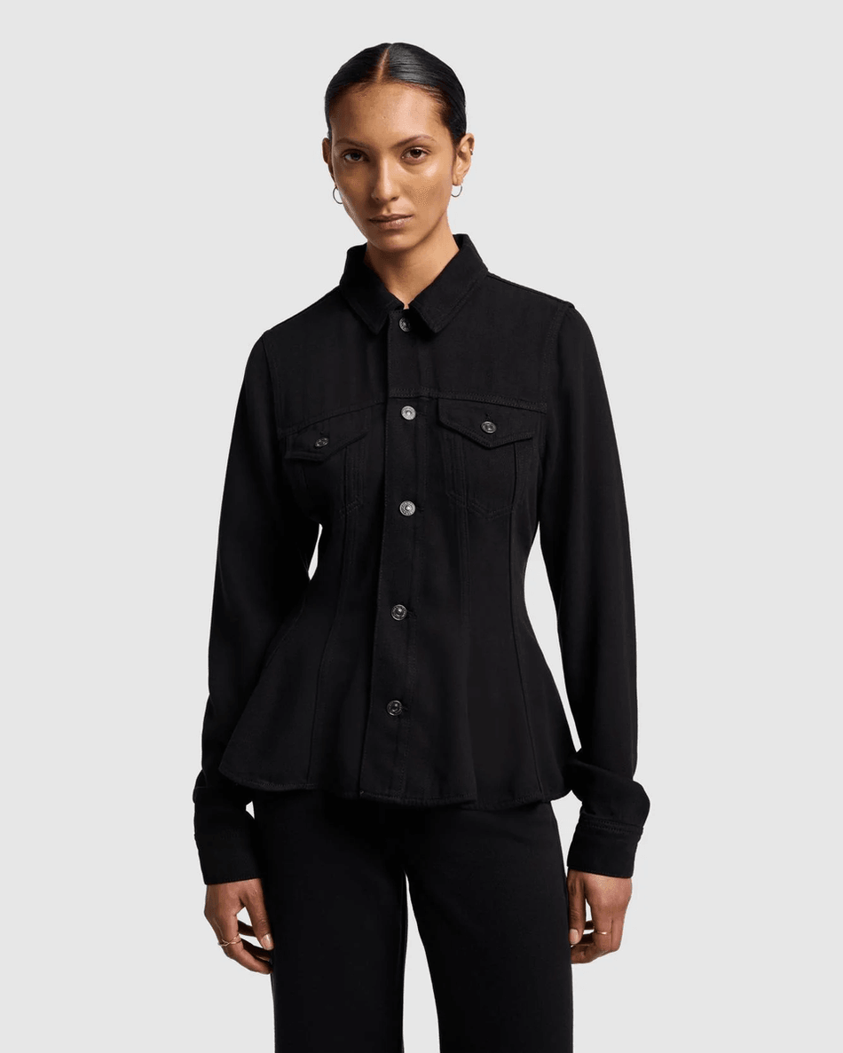 Discover the 7 For All Mankind Denim Lustre Flounce Trucker Jacket in Raven Raven