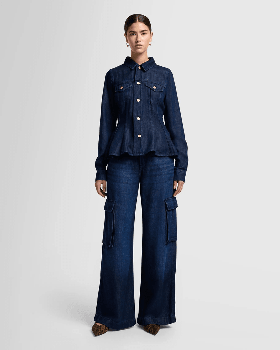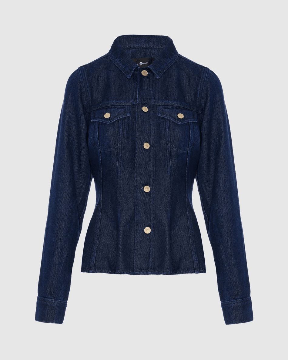 Don't miss out on this fashion essential! Add the 7 For All Mankind Denim Lustre Flounce Trucker Jacket in Stormy Stormy to your collection today and experience the perfect blend of style and comfort.