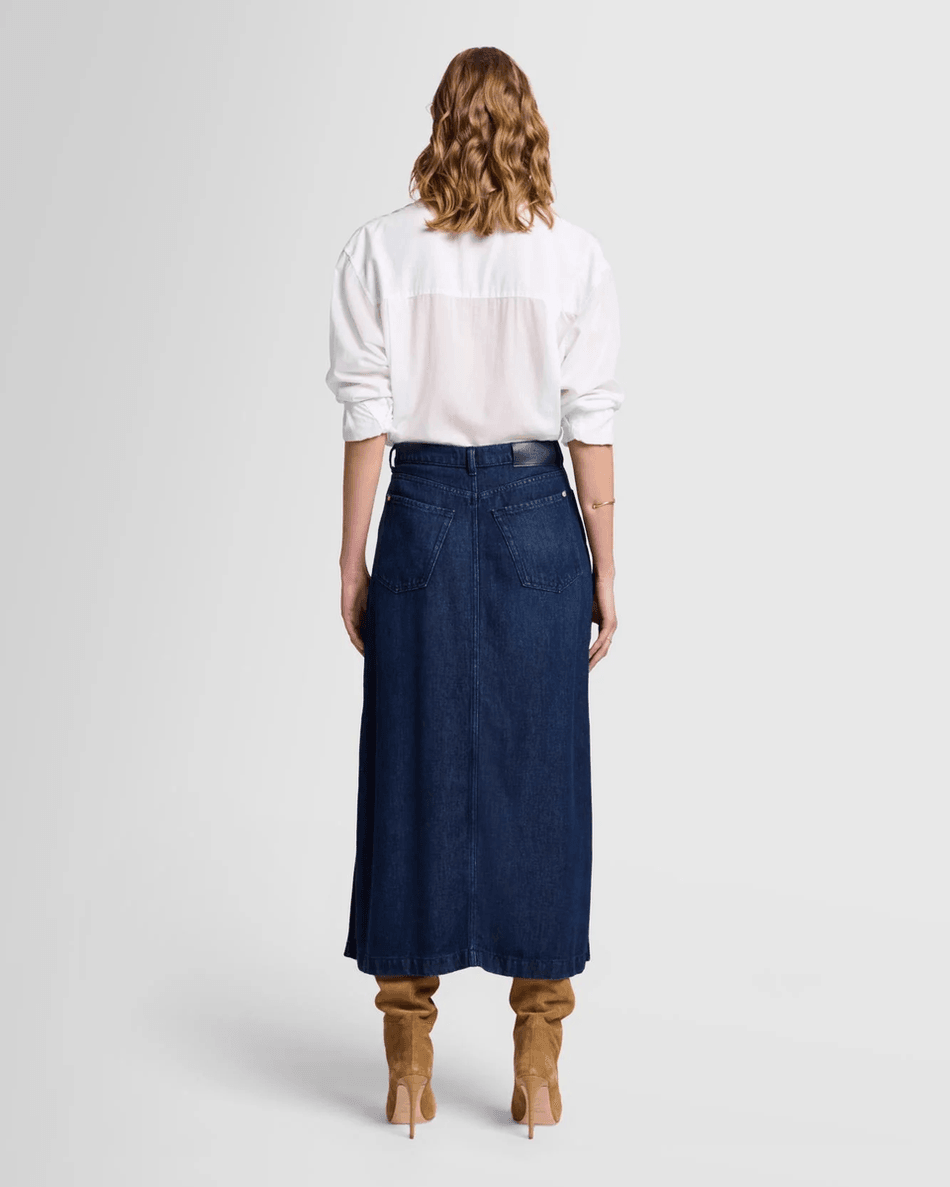 The 7 For All Mankind Denim Lustre Midi Skirt in Stormy Stormy combines fashion and function effortlessly. Its lightweight, rigid fabric gives you structure while maintaining a beautiful drape. Whether you're heading to brunch or out for a casual evening, this versatile skirt pairs beautifully with various tops and footwear.