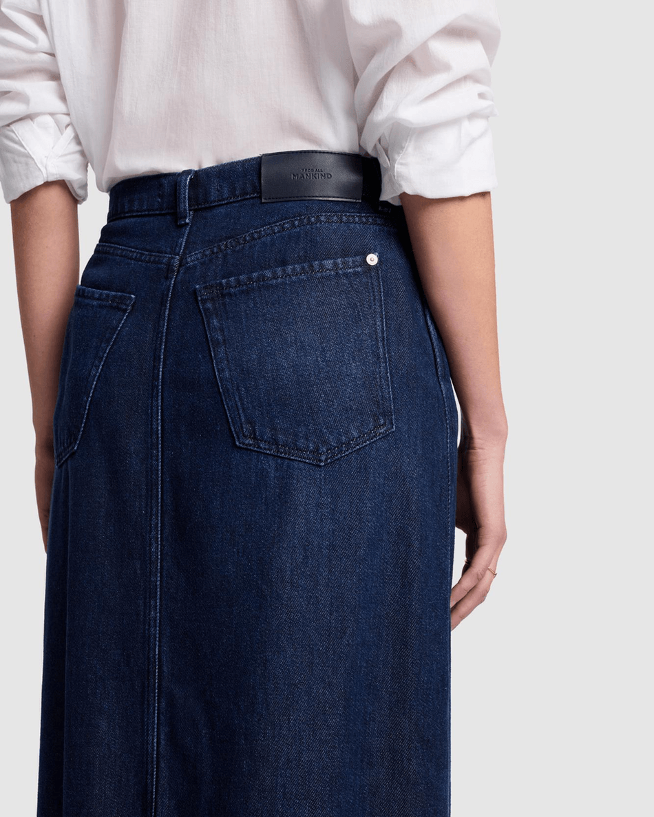 Discover the 7 For All Mankind Denim Lustre Midi Skirt in Stormy Stormy
