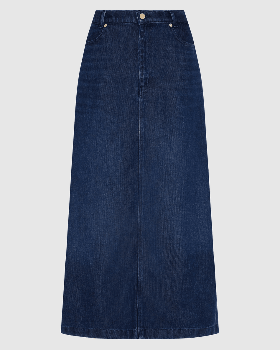 With its elegant design and practical features, the Denim Lustre Midi Skirt is a must-have addition to your collection. Embrace your unique style and make a statement wherever you go.