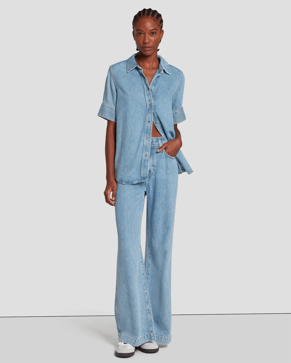 Discover the 7 For All Mankind Denim Lustre Short Sleeve Shirt in Volcan Blue