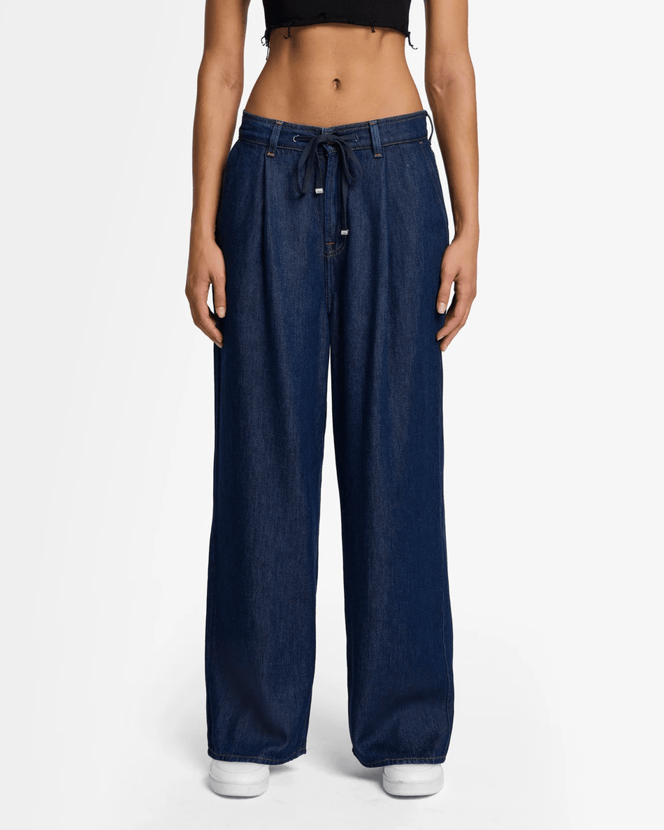 - Stylish Details: Features a dark wash, drawstring waist, and elegant pleated detailing at the front.