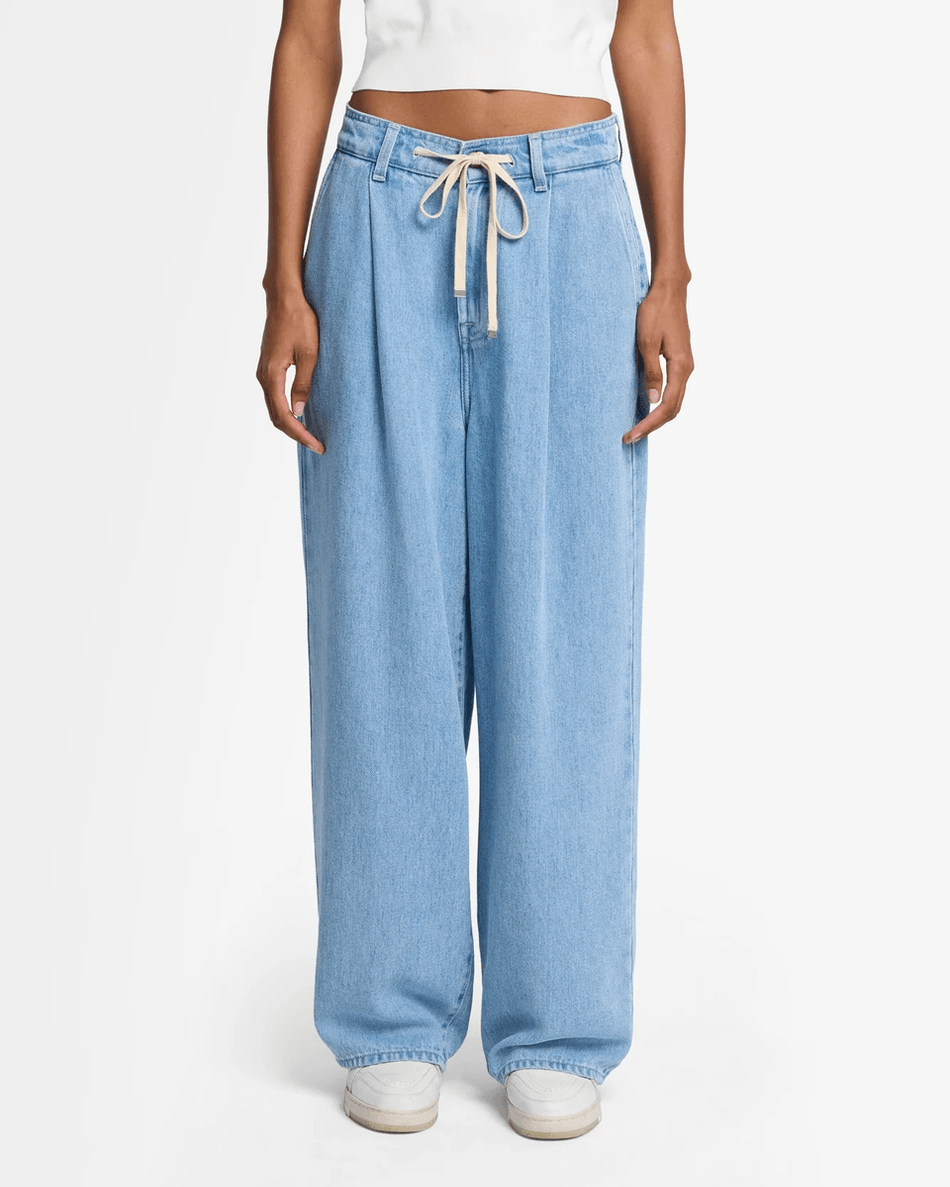 - Stylish Details: Features a light wash, drawstring waist, and pleated detailing for an elevated look.