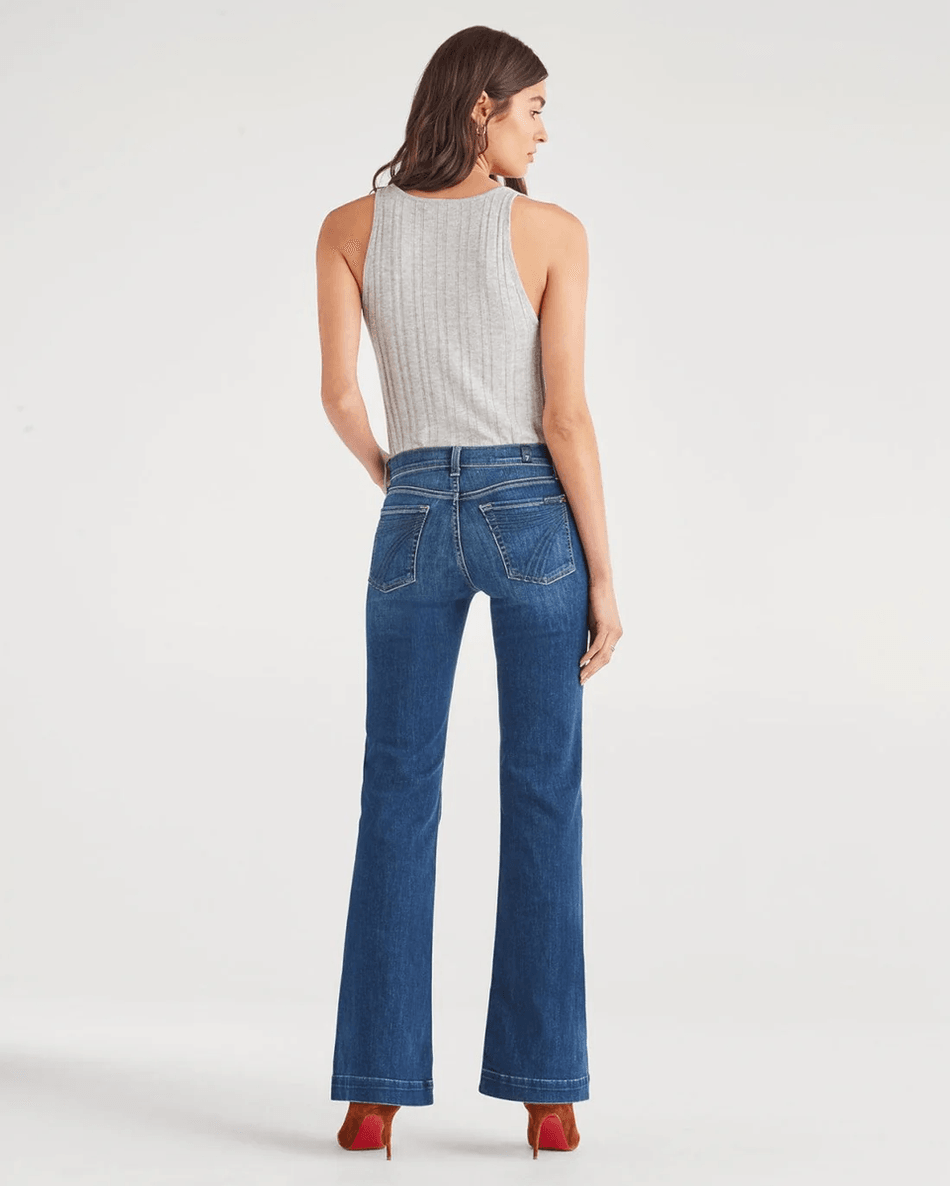 The 7 For All Mankind Dojo in Authentic Blue Malmo features a classic mid-rise fit that flatters all body types. The rich blue hue adds a touch of sophistication, making these jeans ideal for day-to-night wear. With a unique, wide-leg design, they provide a relaxed yet stylish look that is perfect for both casual outings and more formal events.