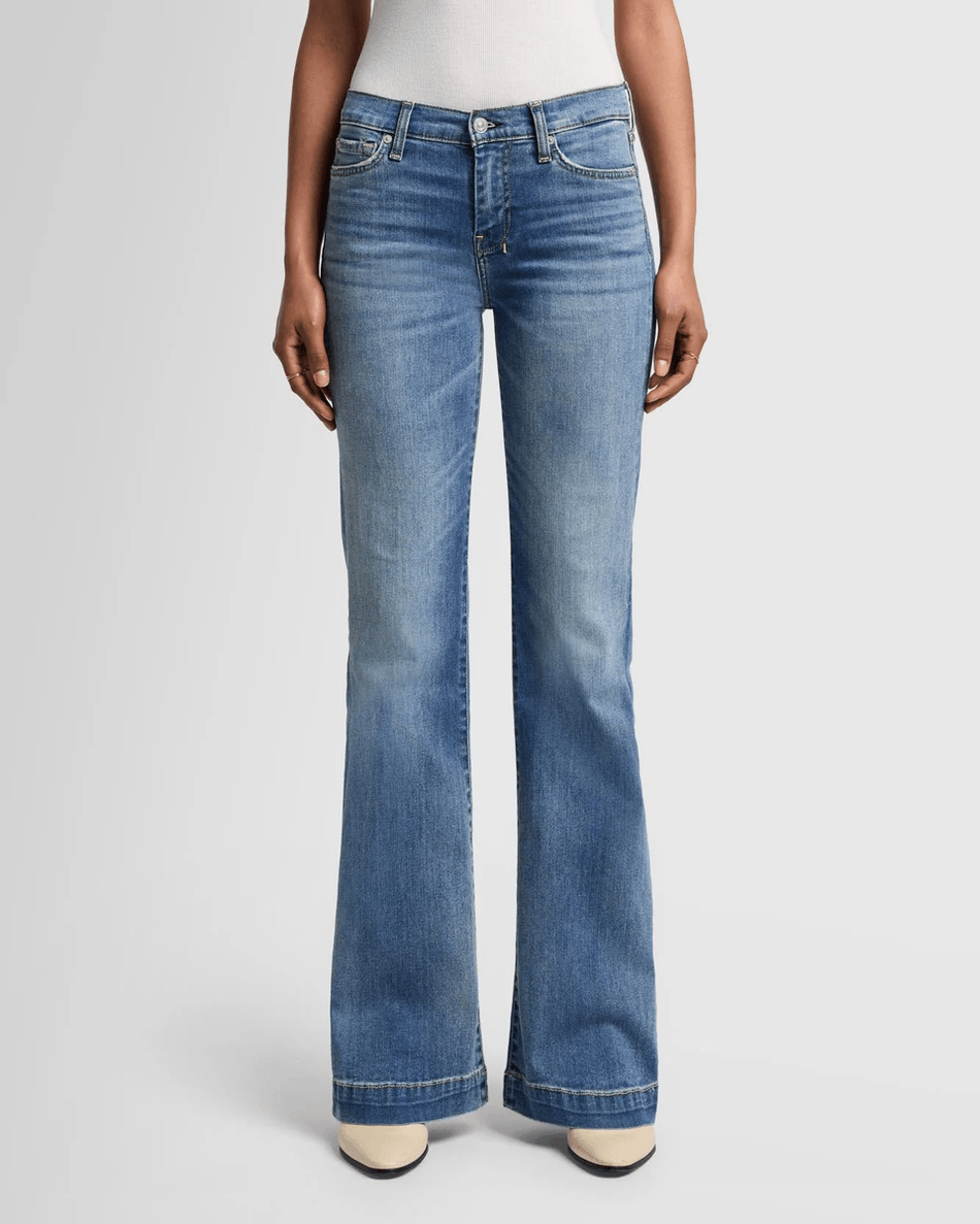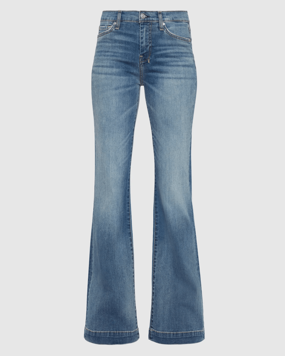 Elevate your denim collection with the 7 For All Mankind Dojo in Distressed Authentic Light. This stylish mid-rise wide-leg fit is designed to flatter your waist and hips, flowing effortlessly into a full-length, relaxed leg. Experience the perfect blend of comfort and style with this classic and authentic denim that offers a vintage vibe.