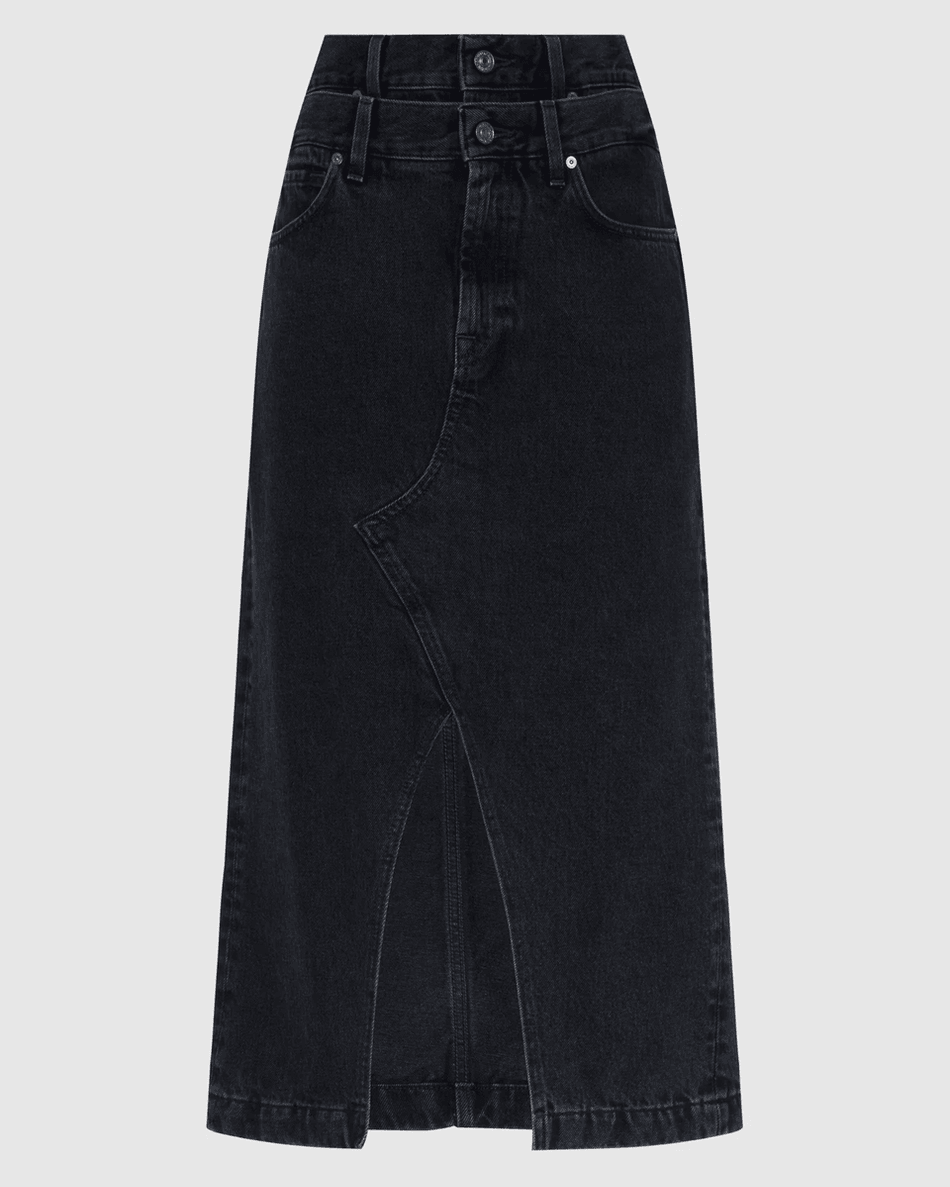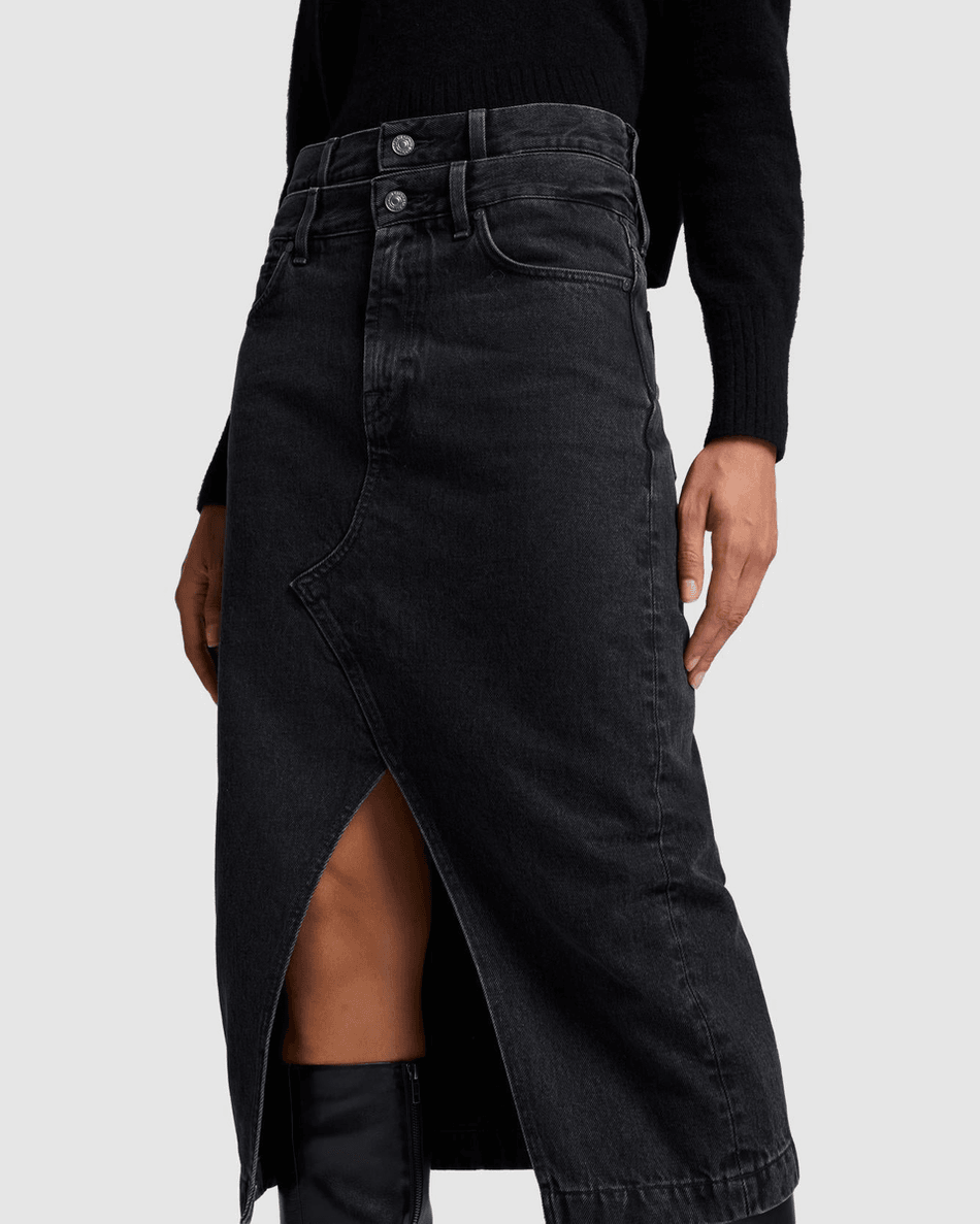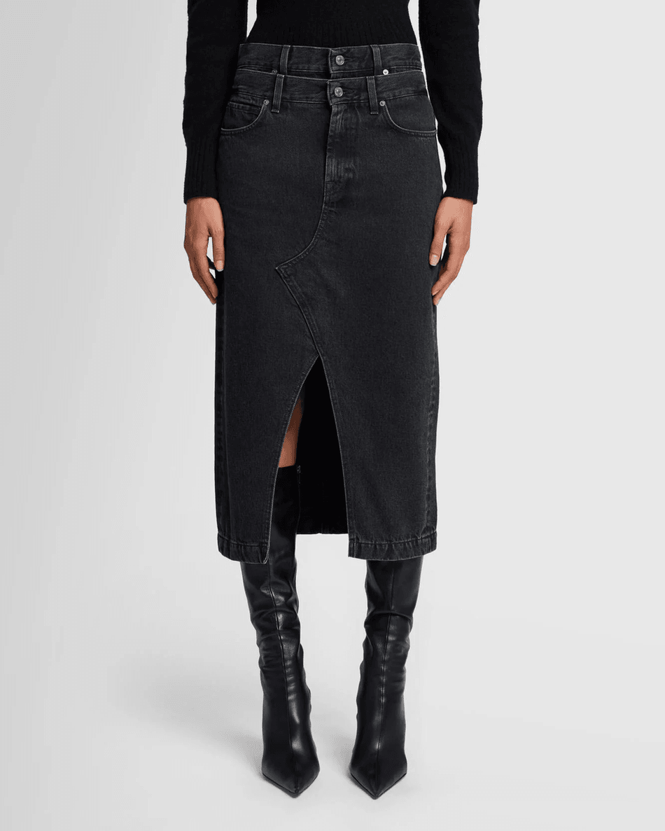 Discover the 7 For All Mankind Double Waist Denim Skirt in Hustle Hustle