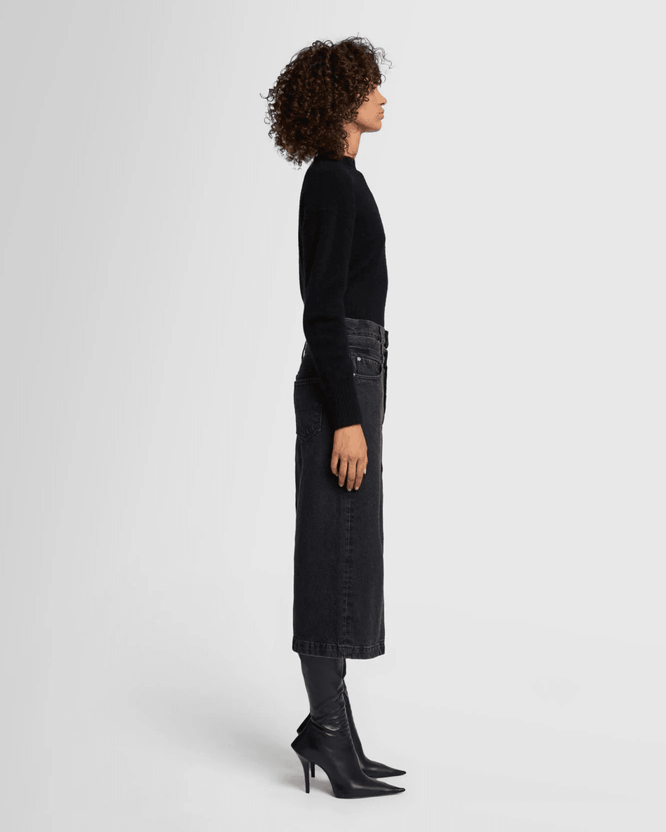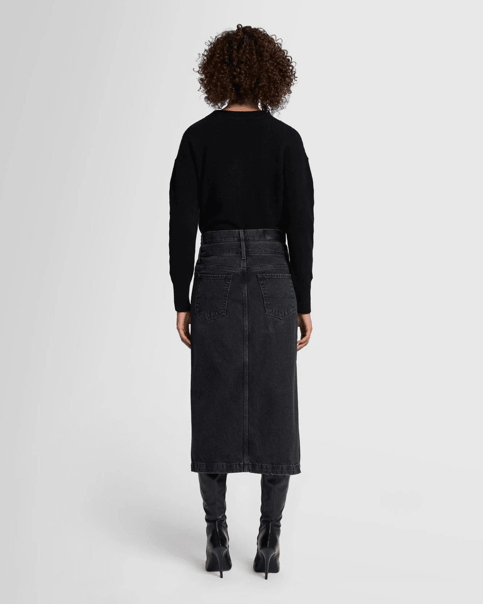Elevate your wardrobe with the 7 For All Mankind Double Waist Denim Skirt in Hustle Hustle. This stunning high-rise midi skirt boasts a fitted design through the hips, effortlessly relaxing at the thighs for a flattering silhouette. Crafted from classic, rigid denim, this skirt improves with each wear, making it a timeless addition to your closet.
