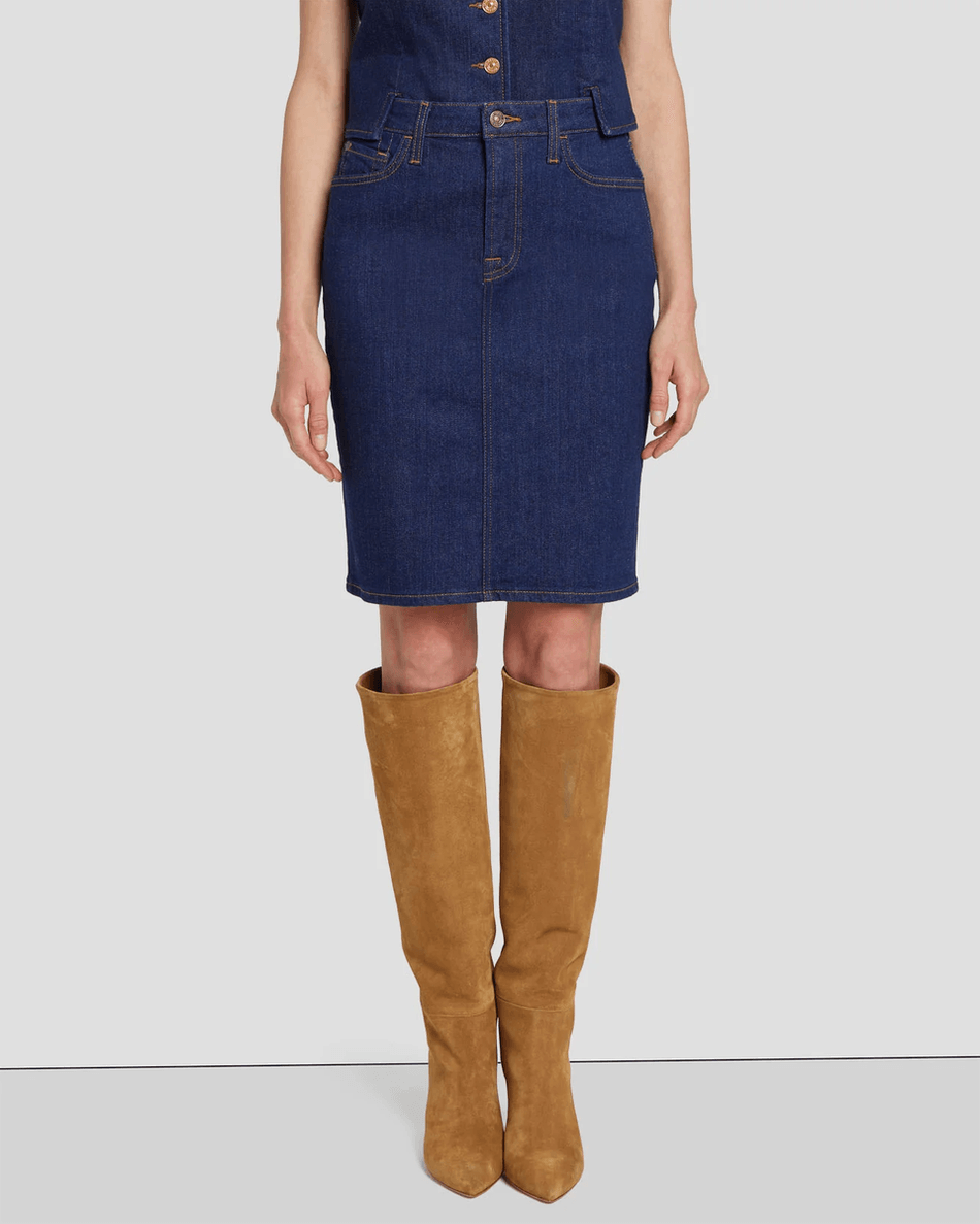 Elevate your style with the 7 For All Mankind Easy Pencil Skirt in Magnolia Magnolia. This timeless silhouette has been beautifully reimagined to fit your modern wardrobe. Crafted from medium stretch, dark wash denim, this skirt combines classic design with contemporary comfort.